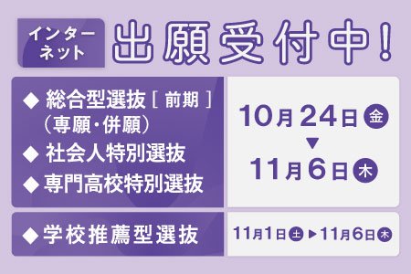 【インターネット出願】■10/24(金)~ 総合型選抜(専願・併願)、専門高校特別選抜、社会人特別選抜 ■11/1(土)~ 学校推薦型選抜(指定校)