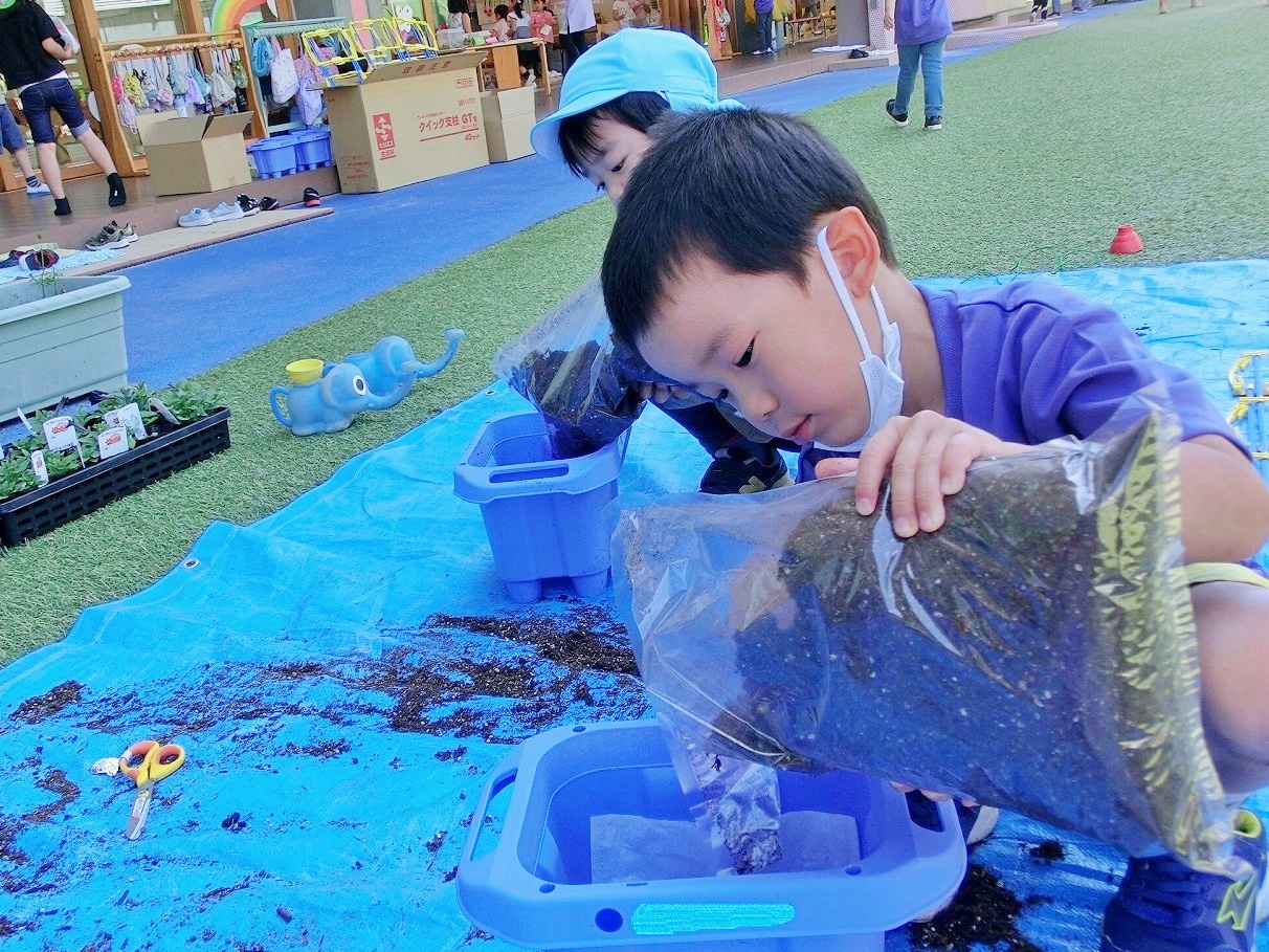 4月に注文していた苗がやっと届きました。子ども達は、とても楽しみにしていましたので、朝から張り切って苗植えをしました。