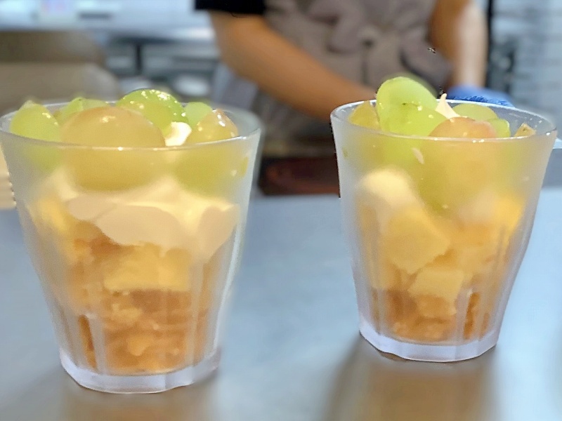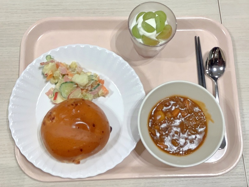 メニューは、子ども達と同じメニューで、ビーフシチュー・さつま芋リンゴサラダ・パンでした。保護者の皆様には、プラス、特別に「ぶどうパフェ」がありました🍇ぶどうパフェは、先日の給食で出たメニューで、子ども達が喜んで食べていたので「保護者の方にも是非💕」と言うことで食堂の方が用意してくださいました。
