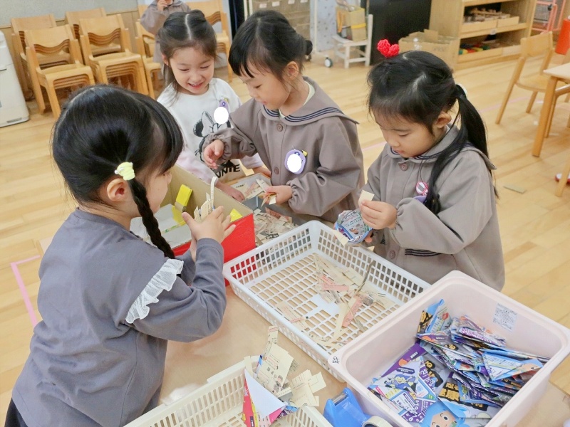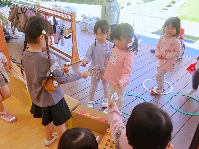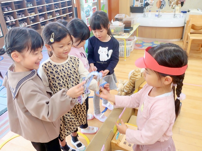 年中ゆり組の子ども達はお店屋さんごっこが大好きです!「ポテト屋さん開きたい!」ということで、準備開始!ポテト、ポテトを入れる袋、フライヤー、看板…などなど、お店に必要なものをみんなで作りました!スタッフも次々増え、準備万端!