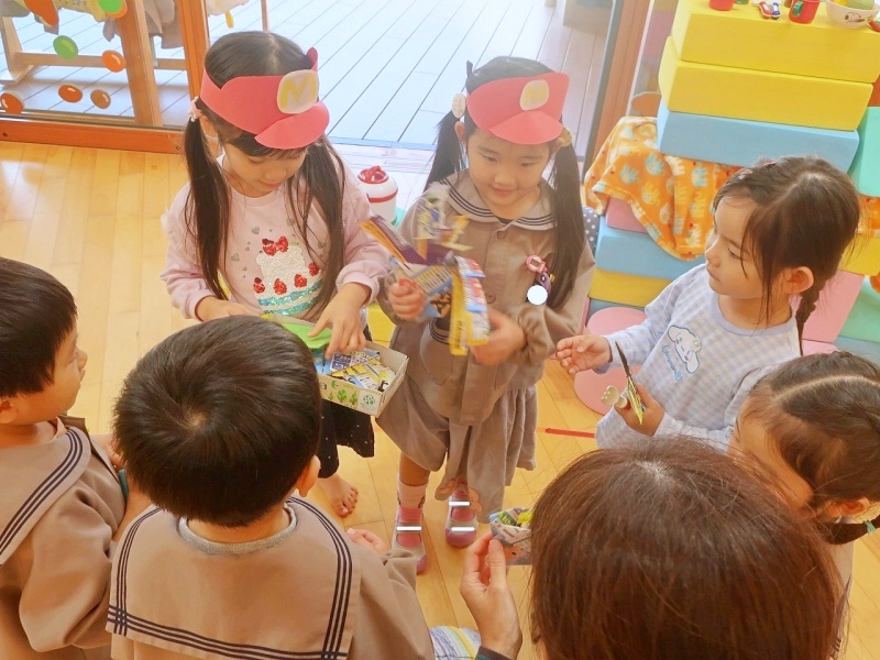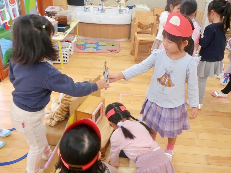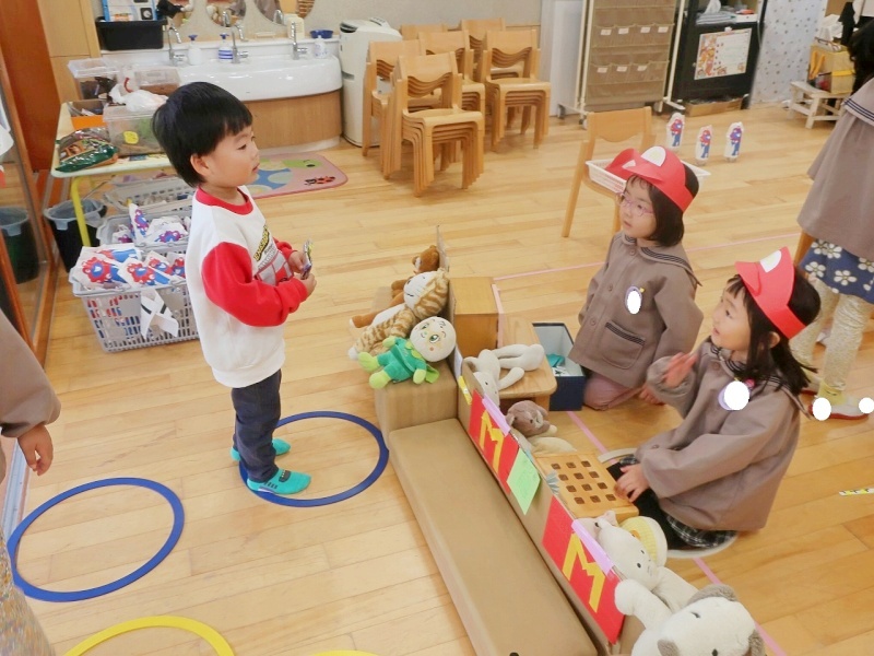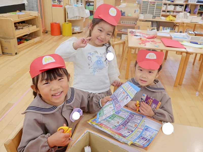 翌日は、「先生、お店の帽子がいる!」とのことで、担任、大急ぎでサンバイザーを用意しました。ポテトと言えば、あのお店!(^^)!赤のサンバイザーに黄色のMをつけて完成!なりきって楽しむ姿が見られました♡