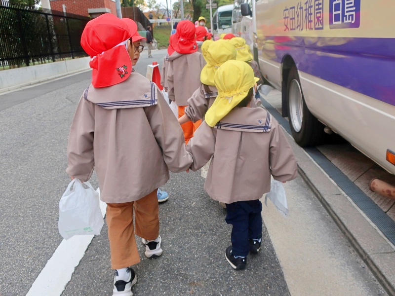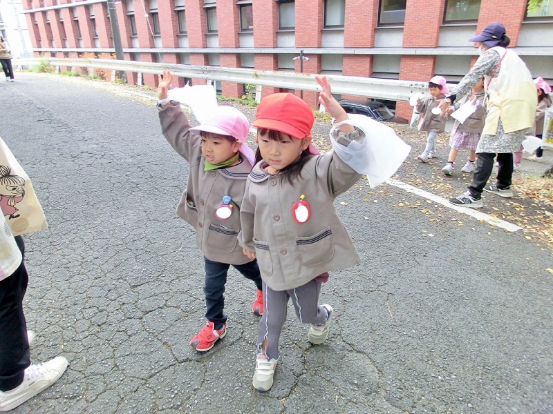 秋も深まり、街の木々が美しく色づいています。 今日は、年少組と年中組の「なかよしペア」で手をつなぎ、園舎横の長寿園の土手まで散歩に出かけました。