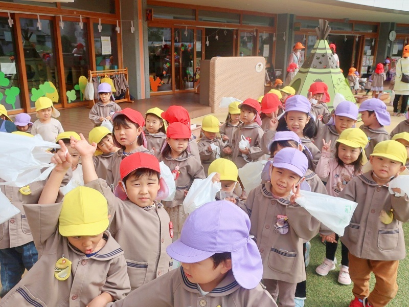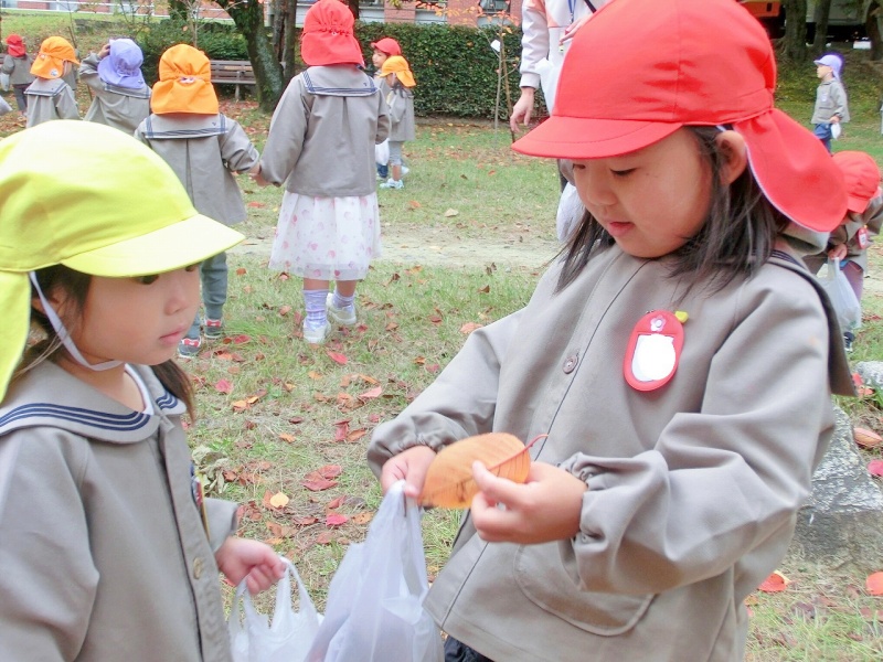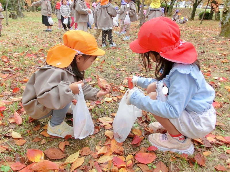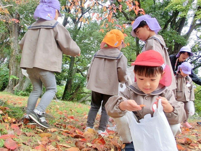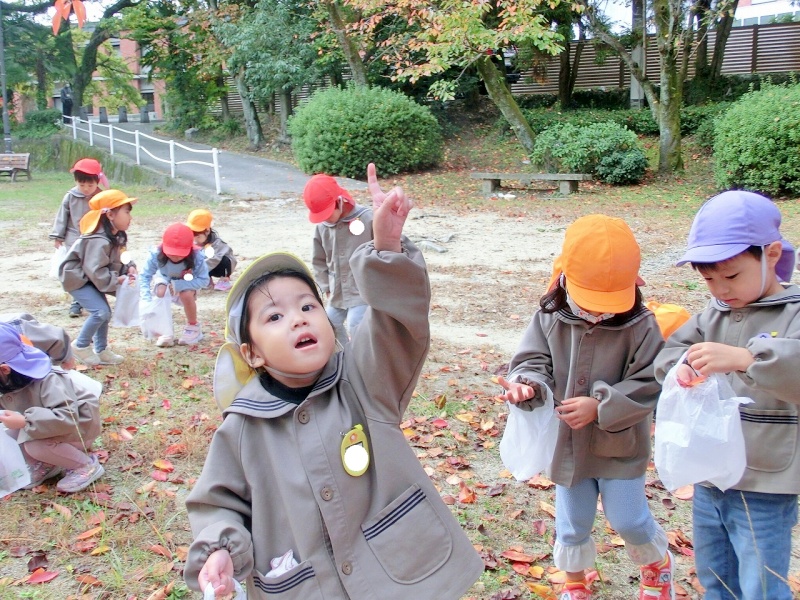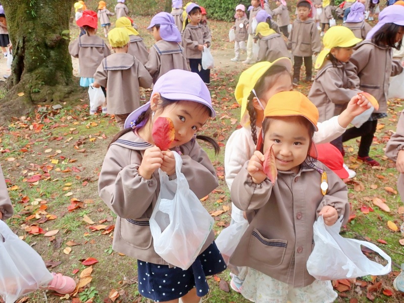 赤く色づいた桜並木を歩きながら「黄色いはっぱ!」「赤いのもあるよ!」と、色とりどりの葉に目を輝かせる子どもたち。 紅葉した落ち葉をどんどん拾って袋に詰め込んでいく子どももいれば、一枚ずつじっくり選んで拾う子どももいました(*^_^*)また、年少組を気にかける年中児の姿をとても頼もしく感じました♡
