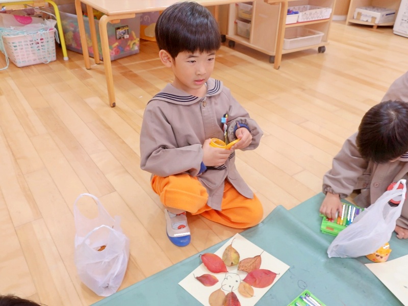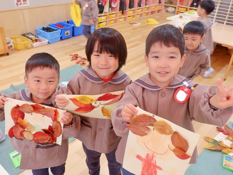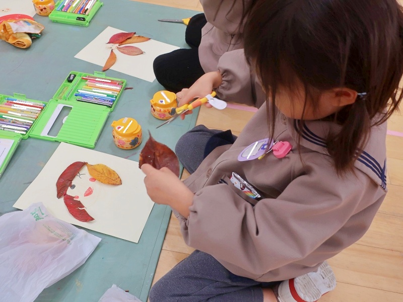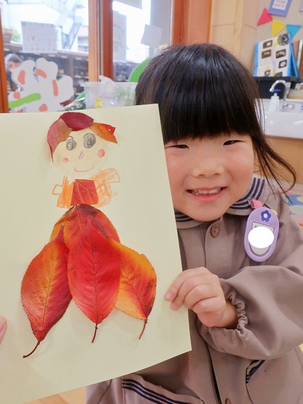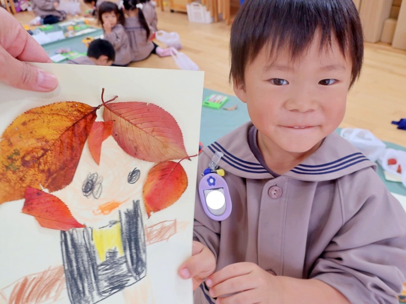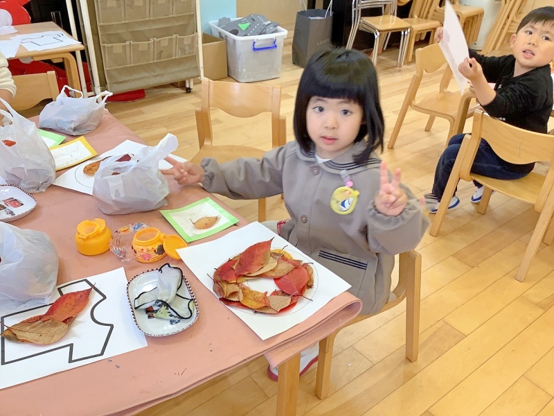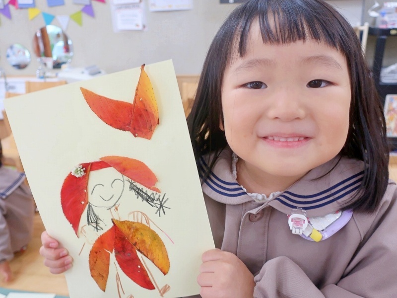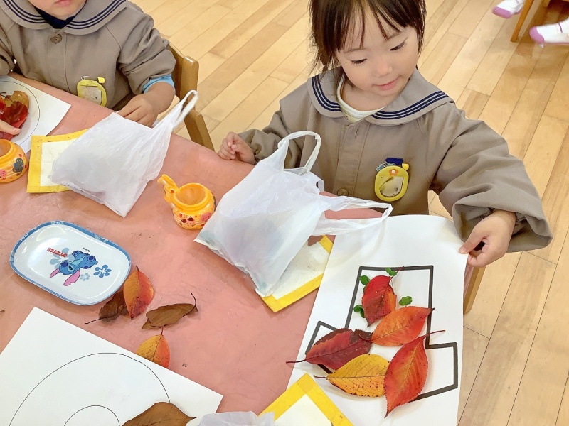 年中組は、思い思いに葉っぱをいろいろな物に見立てて、画用紙に貼り付けていきます。赤や黄色の葉っぱがドレスになったり、細長い葉っぱが虫の羽になったり… 一枚の葉っぱから広がるイメージは無限大✨ 完成した作品は、どれも個性豊かで、ステキでした💖