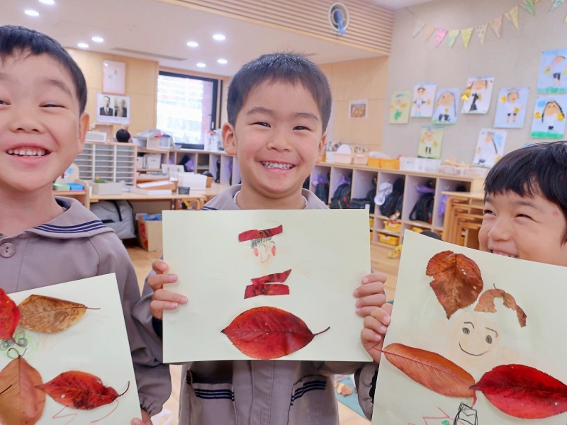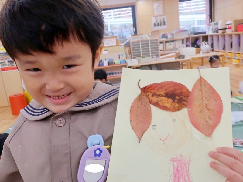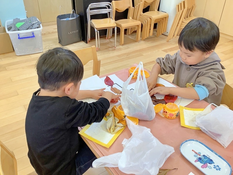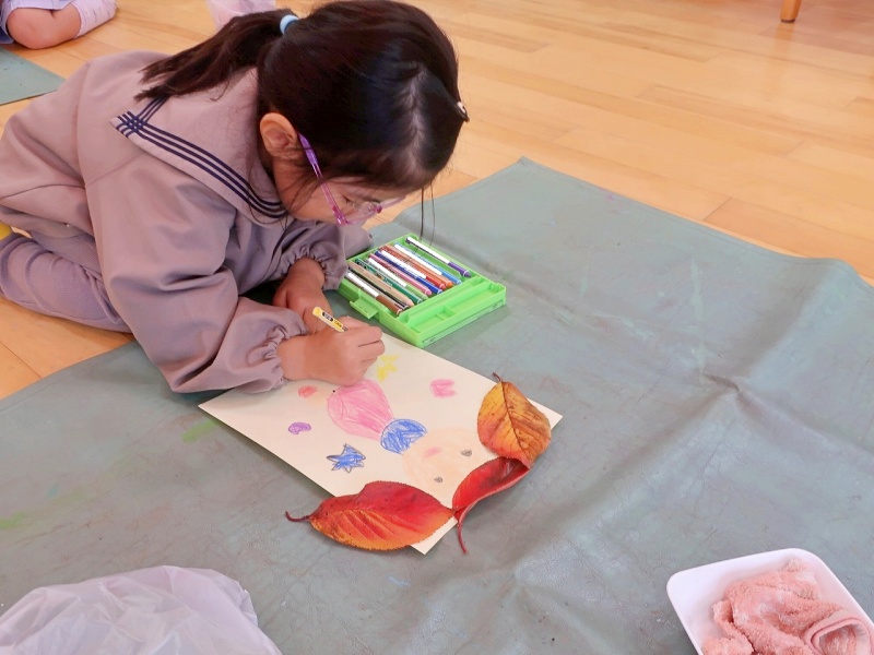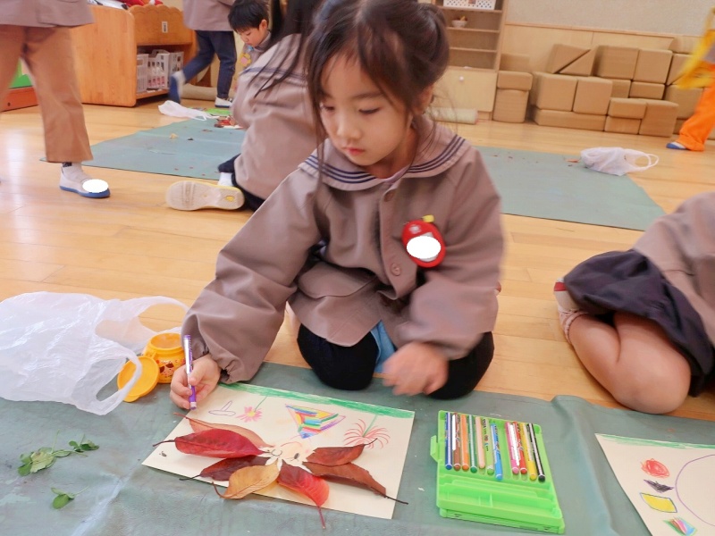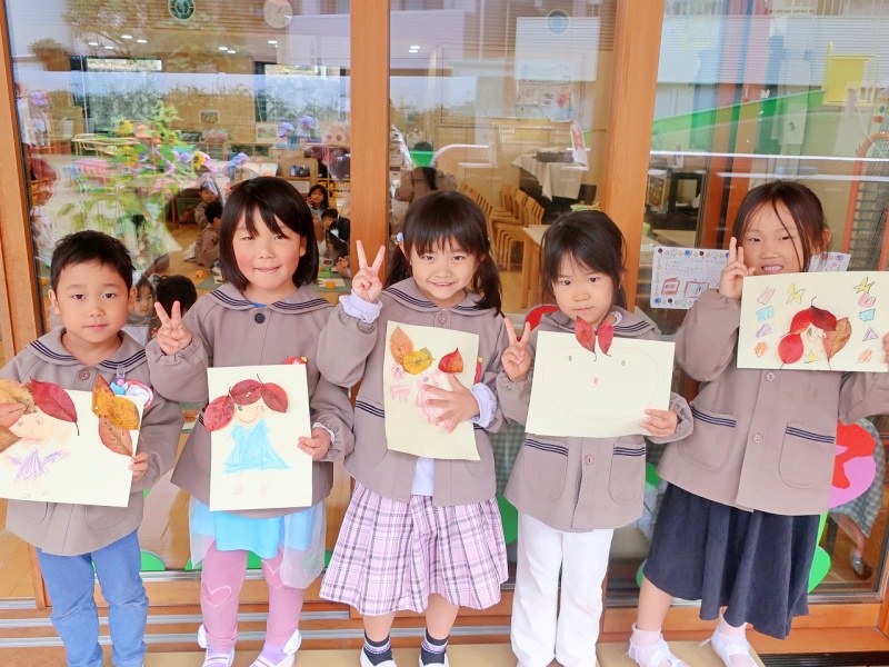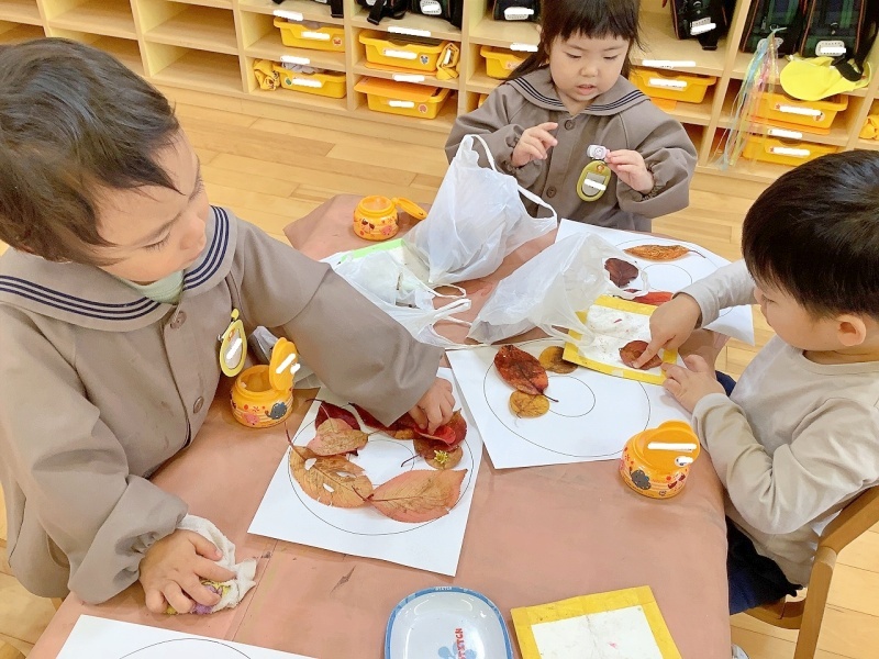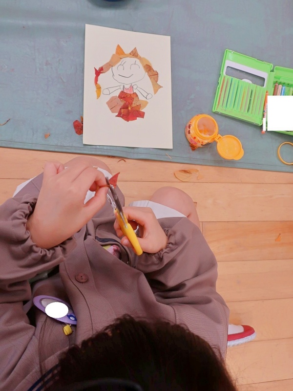 年中組は、思い思いに葉っぱをいろいろな物に見立てて、画用紙に貼り付けていきます。赤や黄色の葉っぱがドレスになったり、細長い葉っぱが虫の羽になったり… 一枚の葉っぱから広がるイメージは無限大✨ 完成した作品は、どれも個性豊かで、ステキでした💖