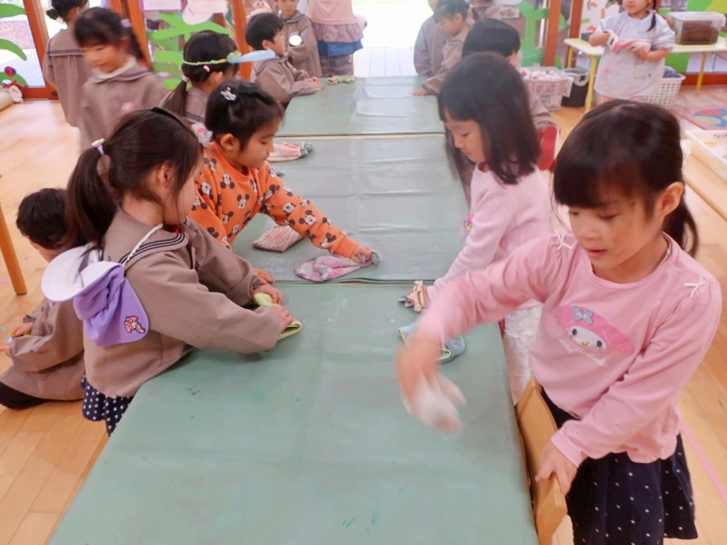 「もったいないばあさん」の絵を絵の具で塗ったあと、数名の子どもにパレットを洗うことを任せると、「わたしもやる!」「ぼくも手伝う!」と、自然とまわりの子どもも集まってきて、みんなで協力して片付けをしてくれました。