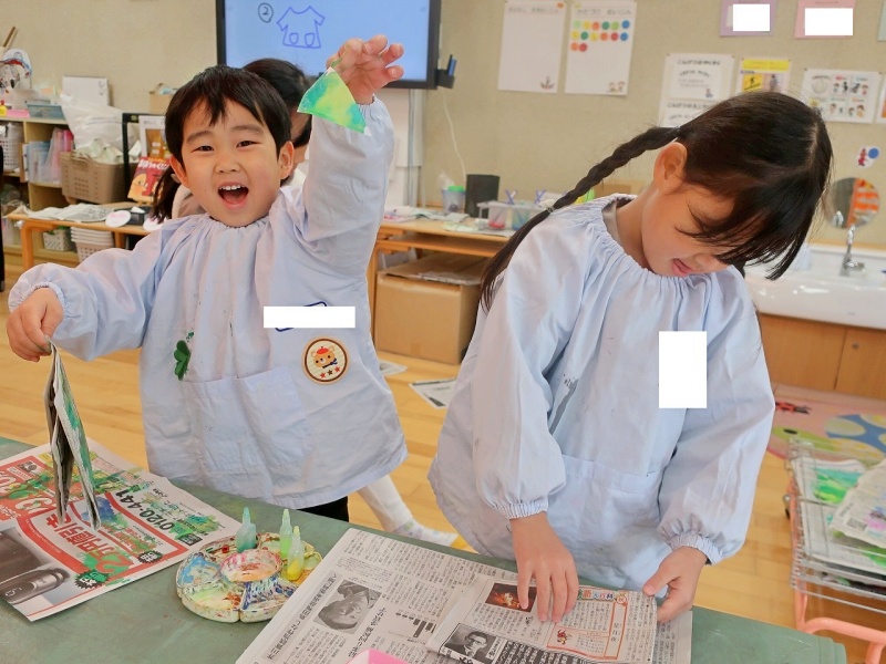 にじんで混ざり合う色の変化に「わあ、きれい!」と目を輝かせながら取り組んでいました。