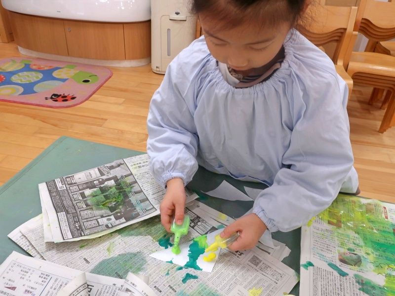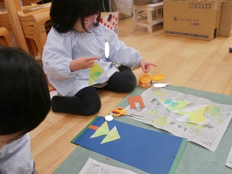 年中組では、クリスマスに向けてツリーの制作を行いました。三角に切った和紙に、緑・黄緑・黄色の絵の具をスポイトでぽたぽた…。