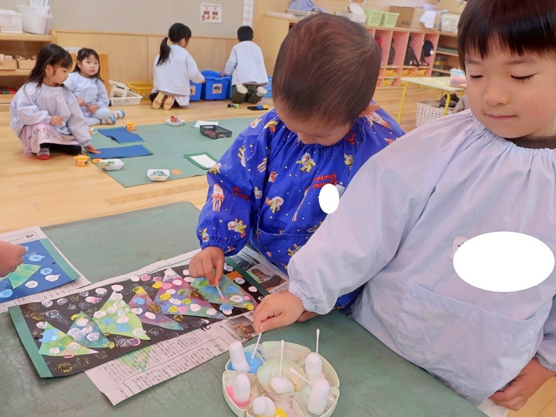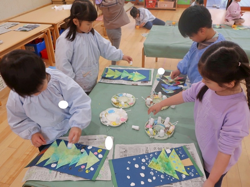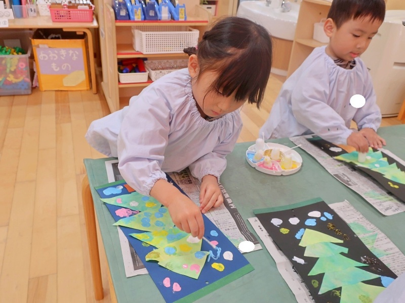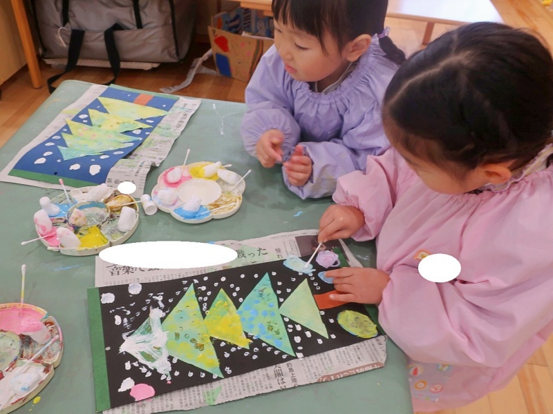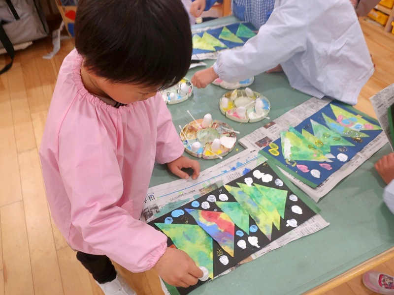 染めた三角の和紙を台紙に貼りつけたあとは、綿棒や丸いスポンジを使って、色とりどりの絵の具をぽんぽんぽん!子どもたちは「雪が降ってるみたい!」「ここはピカピカのライトだよ」と、雪やイルミネーションを思い浮かべながら、楽しそうに飾りつけをしていました✨
