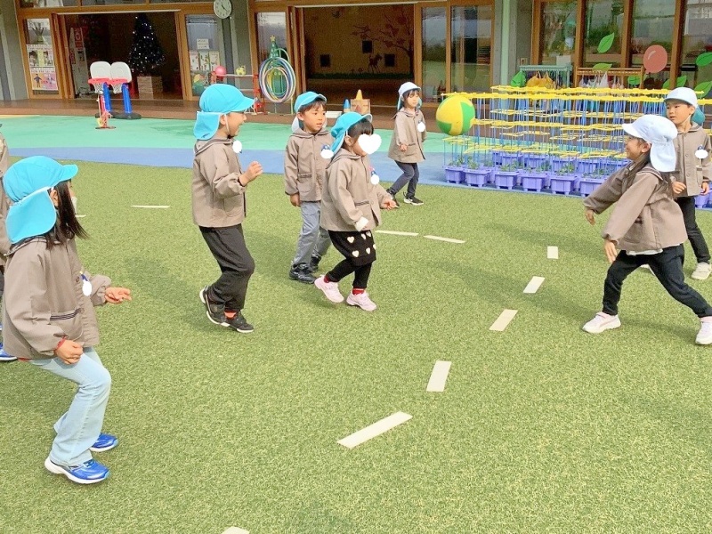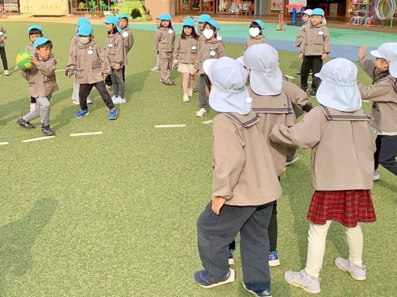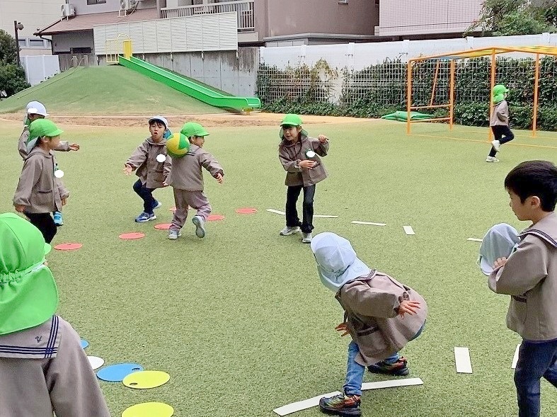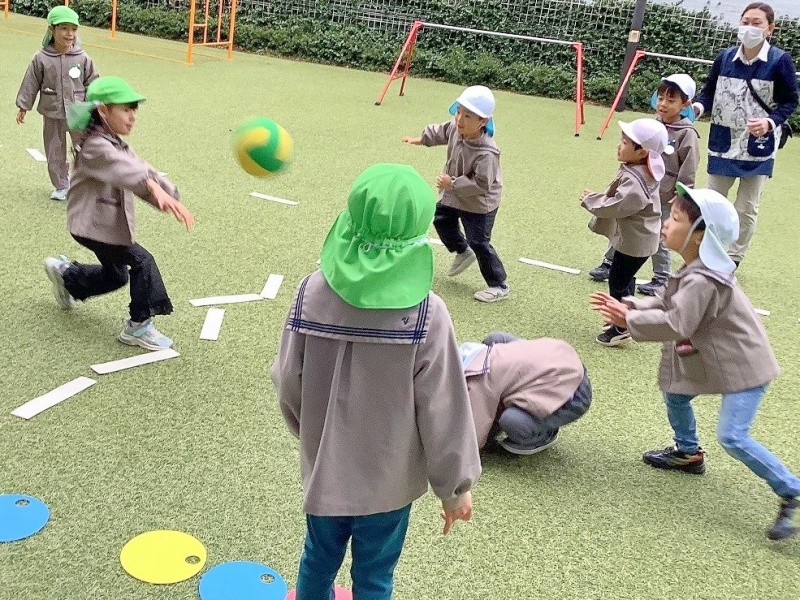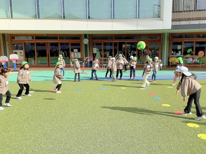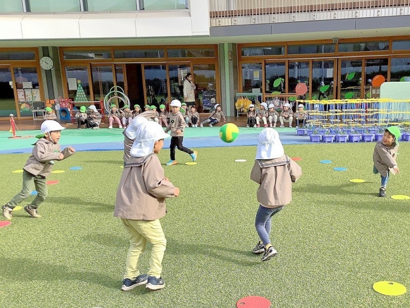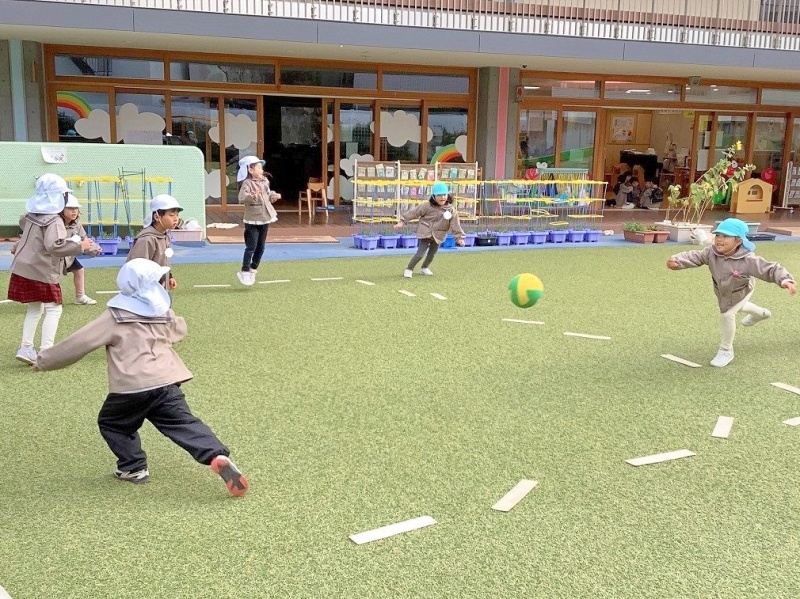 はじめは、ボールの投げ方・取り方・逃げ方に苦戦している子どもたちが多くいましたが、回を重ねるごとに、ボールをよく見てコートの中をうまく駆け回る子どもたちが増えてきました。最近では友達を誘って自分たちでコート作りやチーム分けをする姿も見られ『さすが年長組!』と感心します✨