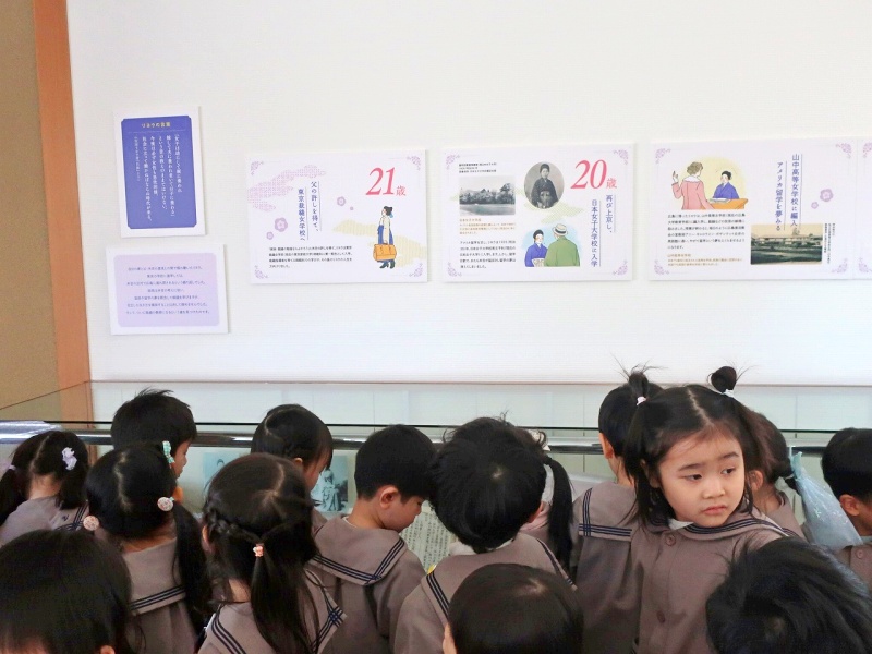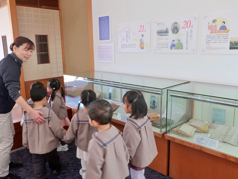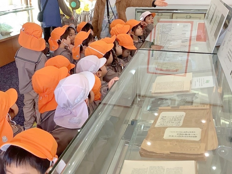 館内では、担任から「リヨウ先生」の生い立ちや、教育にかけた思いを聞いたり、国から贈られた賞状や、実際に使われていた書物など、貴重な展示品を見たりしました。子ども達は、「ここに住んでたの?」「大きな賞状だ!」と、興味津々でした。