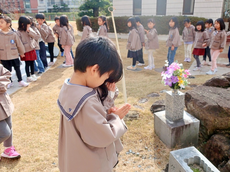 また、記念館のそばにある原爆慰霊碑にも立ち寄り、原爆で亡くなられた学園創設者のおひとりであり「安田リヨウ先生」の夫である「安田五一先生」やたくさんの教職員・生徒の皆さんに静かに手を合わせました。1月21日には、111回目の創立記念日を祝う式を幼稚園遊戯室に全園児が集い、実施する予定です。