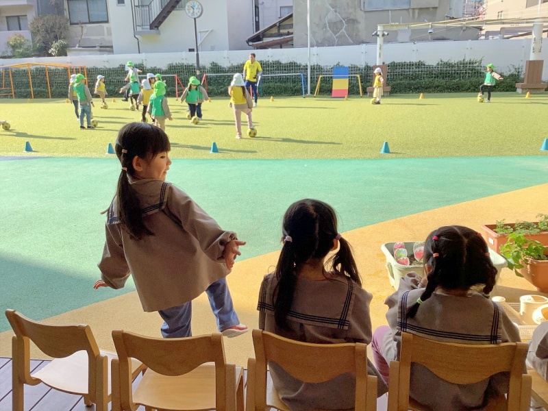 この日は、年長組のサッカー教室の日でした。外部コーチが来園し、サッカー教室が始まると、自分たちでどんどん椅子を並べて、自主的に見学を始める年少りす組の子ども達(*^-^*)