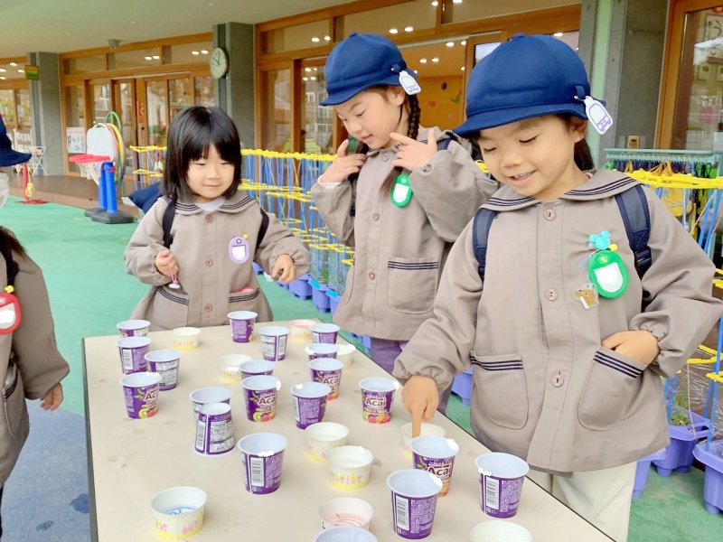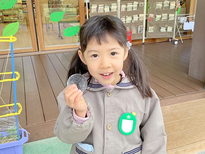 そして雪がちらつく寒い朝を迎え、登園してきた子どもたちは「氷どうなっとるかね?」「カチコチだぁ!」「あれ?氷の下はまだ水がある…」「冷たーい!」と、用意していた入れ物の氷を観察したり、喜んで見たりしていました。年中児や年少児も「氷だ♡」「僕たちもやってみたい!」と興味津々で見ていて、いろいろなクラスで氷づくりの準備が始まっていました。