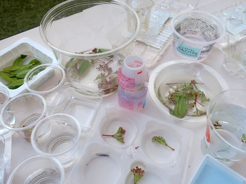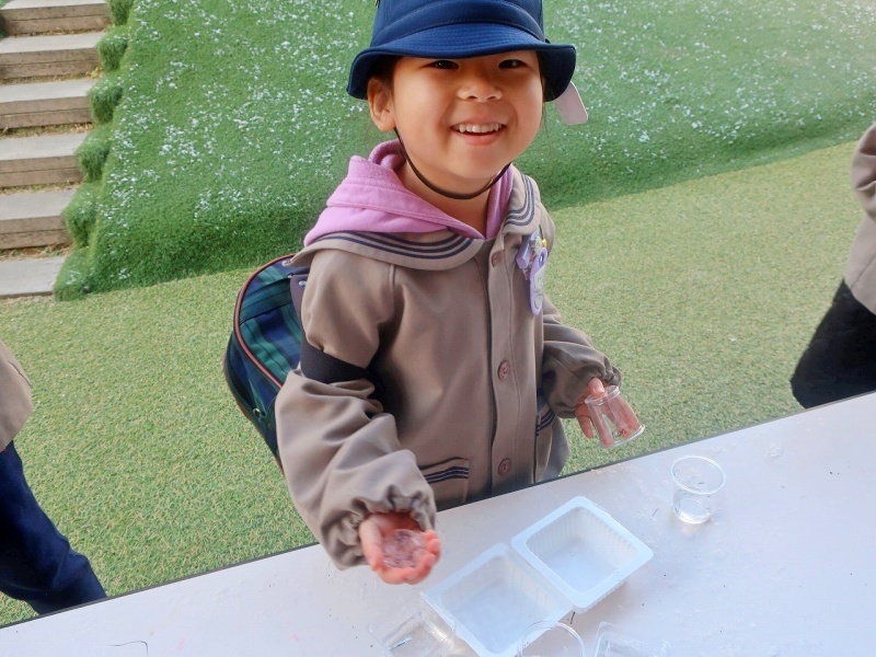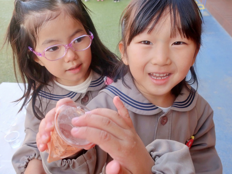 年長組に、「どれぐらい水入れたの?」と聞くと、年長児が「これぐらいだよ!」と指で教えてくれました。その指の幅を覚えて、水を入れる子どももいました!(^^)!