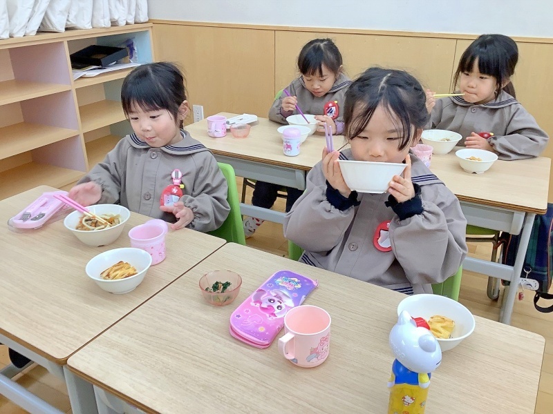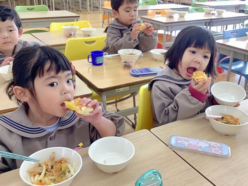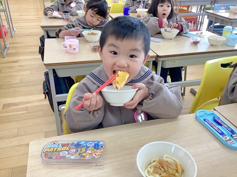 アップルパイを楽しみに、うどんをすする子ども達(*^-^*)