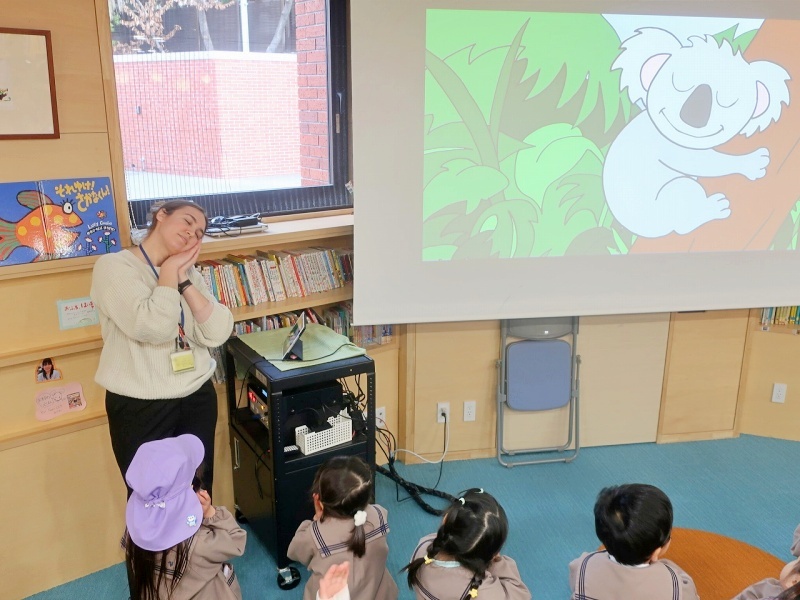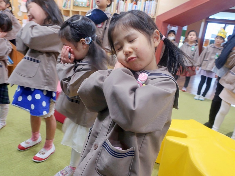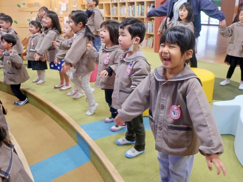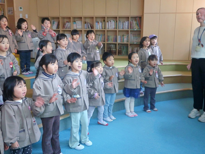 安田小学校のネイティブの先生が、毎週幼稚園に来てくださっています。 先生の明るい声やリズムに引き込まれ、英語の歌に合わせて踊ったり、先生のジェスチャーを真似してみたりと、ワクワクした表情で参加しています。 ネイティブの先生との時間が、英語への親しみに繋がっています♪