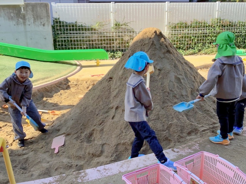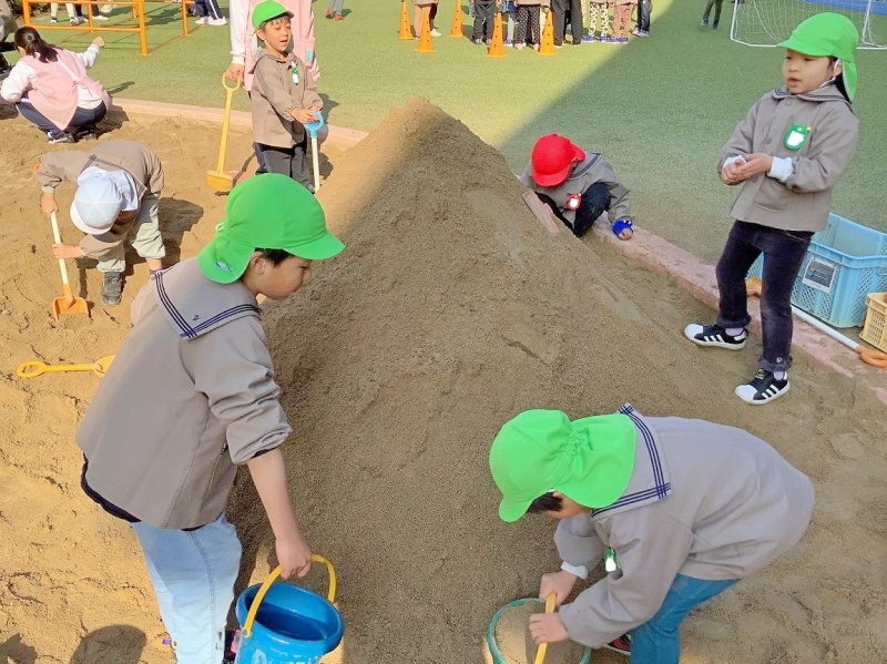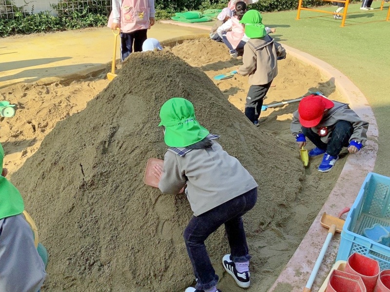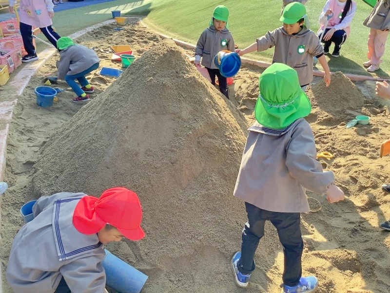 崩れても諦めずに作り直したり、ほかの遊びをしていた子どもたちが「入れて!」と参加したりして、何日も砂山づくりが続いています。最初は年長児だけでしたが、今では年中児・年少児も一緒になって作っています!
