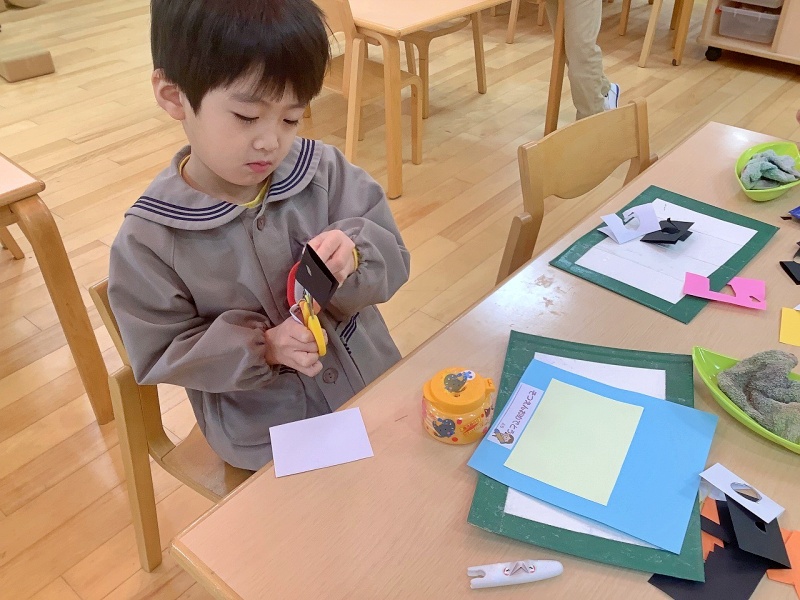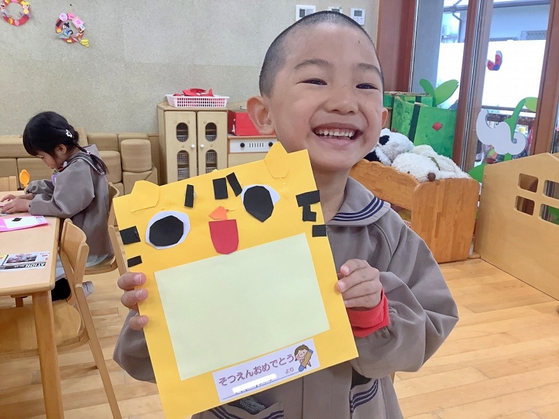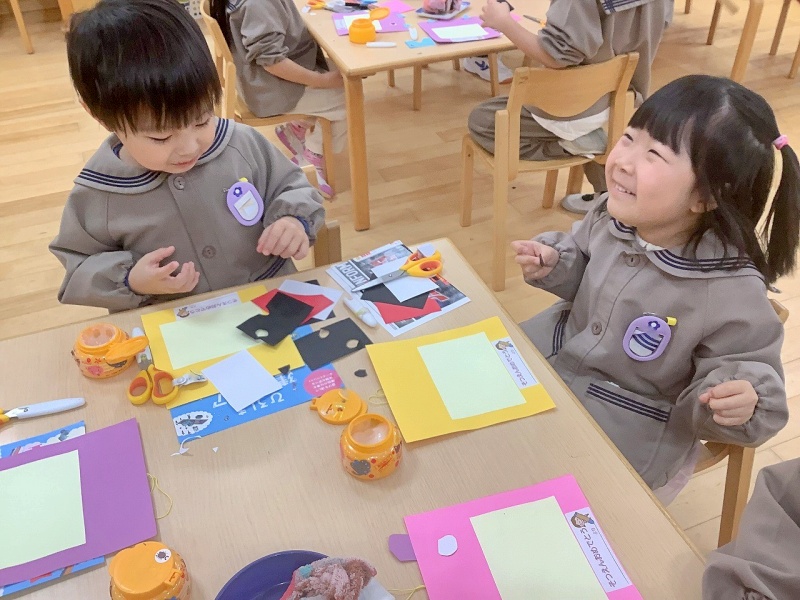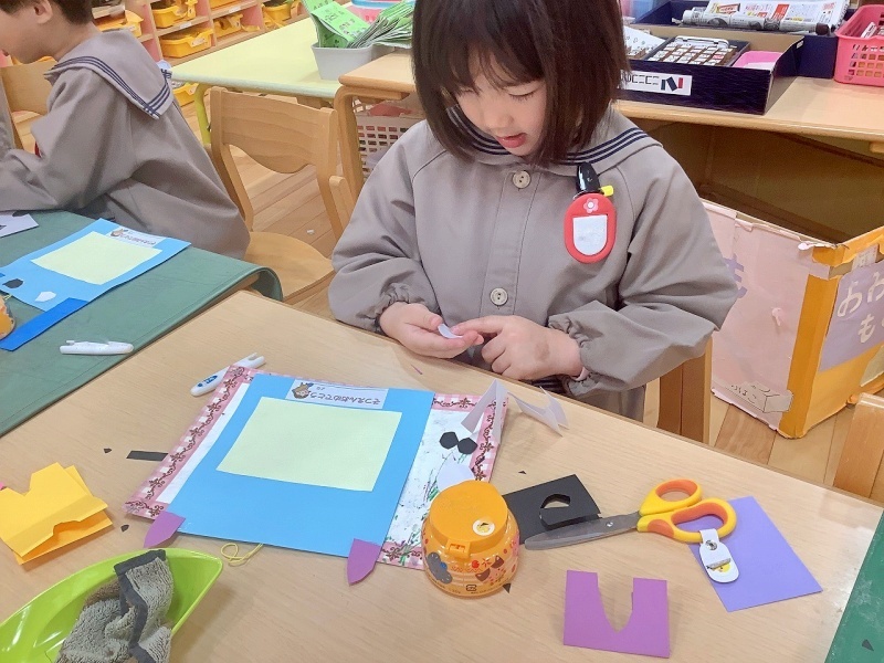 これまで、優しくリードしてくれた年長さんが、もうすぐ卒園します。異年齢で活動する時の「なかよし3人組」の年長さんに、心を込めてプレゼントを作りました!