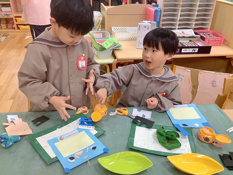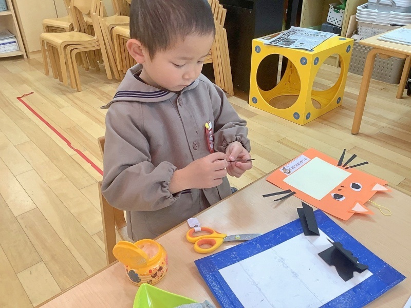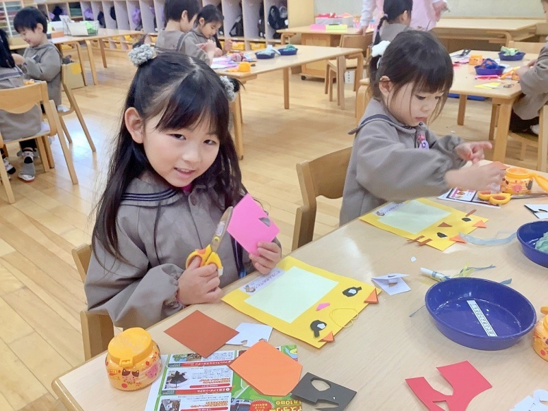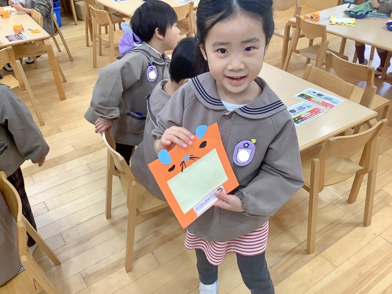 年中組が作ったのは、動物の写真フレーム🐶🐈🦁🐼「なかよし3人組」の写真を貼ってプレゼントします!その日までは、ひみつです💛