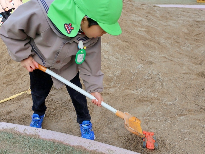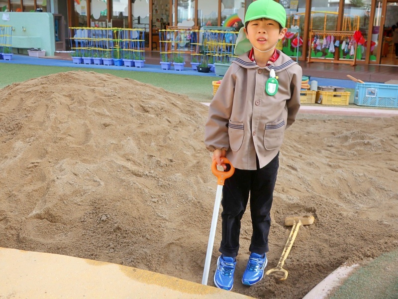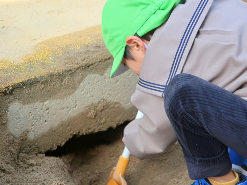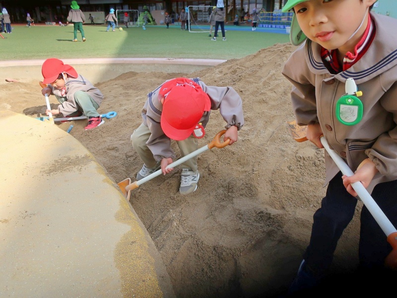 年長組の男児が、せっせと砂場を掘り進めていました。