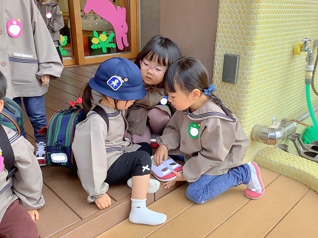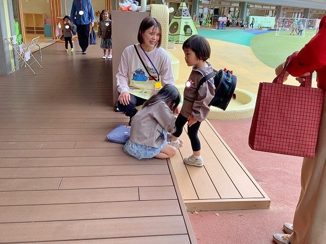 「分かる?」「ここに片付けるんだよ!」と優しく声をかけながら、ロッカーや靴箱の場所を教えてくれたり、一緒に遊んでくれたりしていました💛