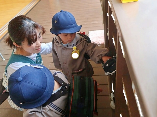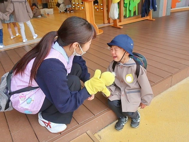 ニコニコ笑顔、泣き顔、ドキドキした顔・・・様々な表情で登園する年少児の姿が見られる中、
