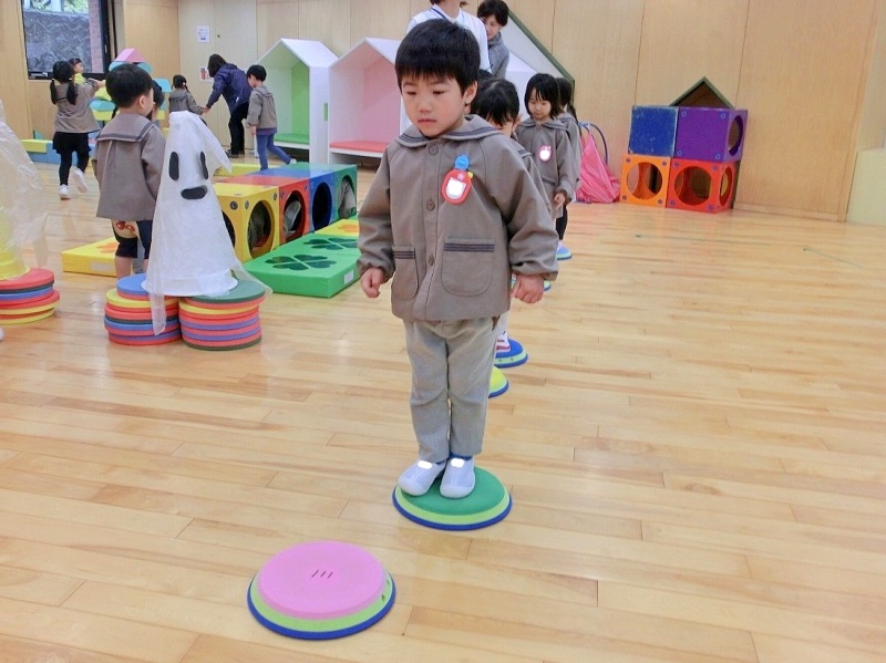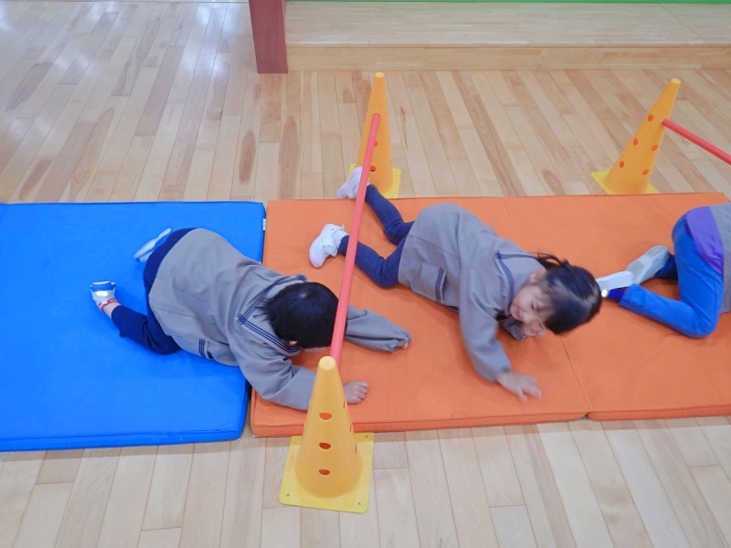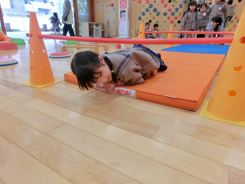低いバーをくぐったり、バランスをとってでこぼこ道を歩いたり、体をしっかりと動かして遊びます♪