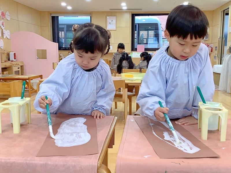 年少組が白色の絵の具を筆に取り、何かを描いています。 「おっきかったよね~」「長いよ…