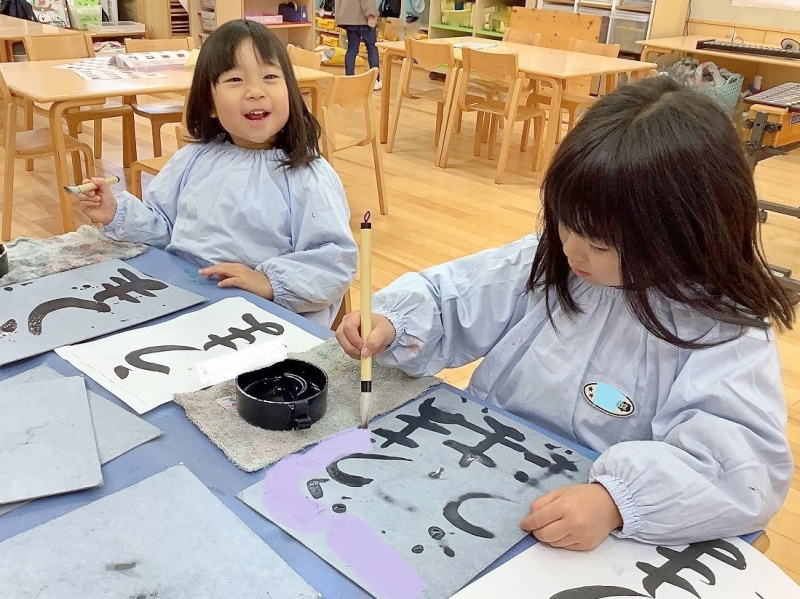 毎年、年長児が取り組んでいる書き初め。今年の干支「うま」の文字を書きました。 初めに…