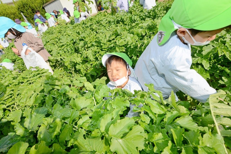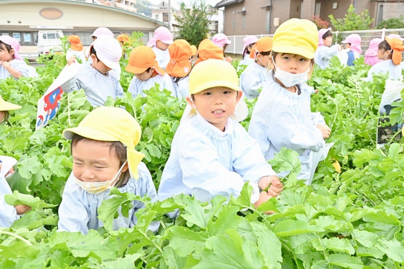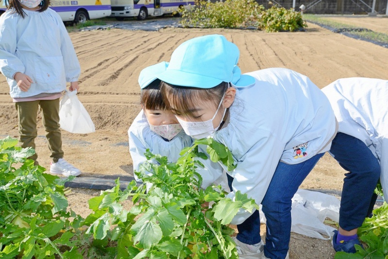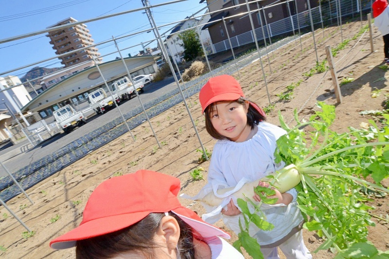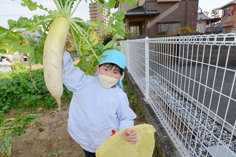 安佐南区上安にある学園の農園へ、大根の収穫に出かけました。 農園のお世話をしてくださっている方々が、日々大切に育ててくださったおかげで、大根はどれも立派に生長!
