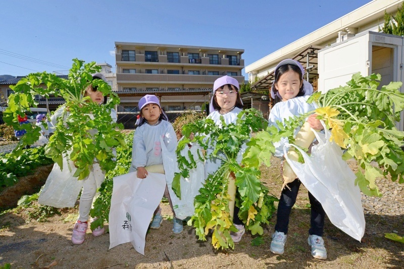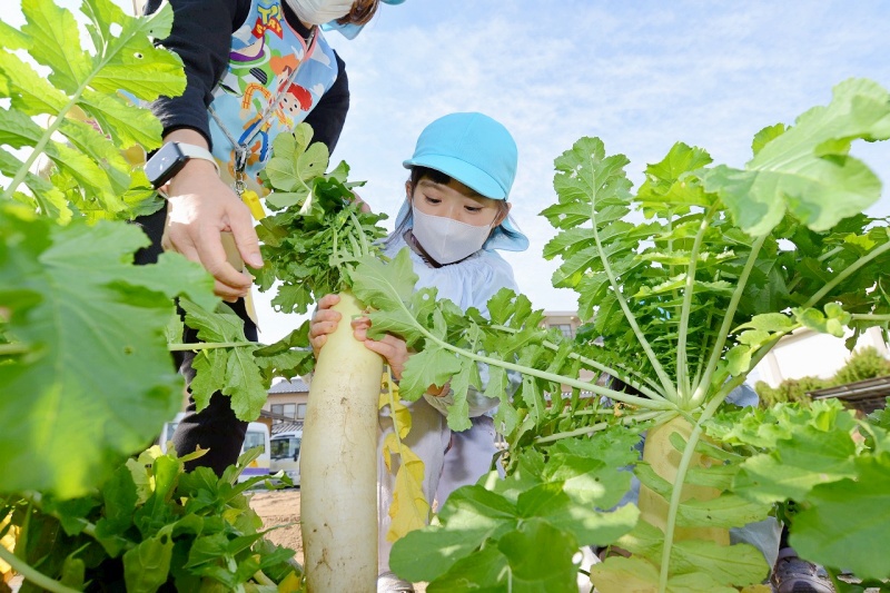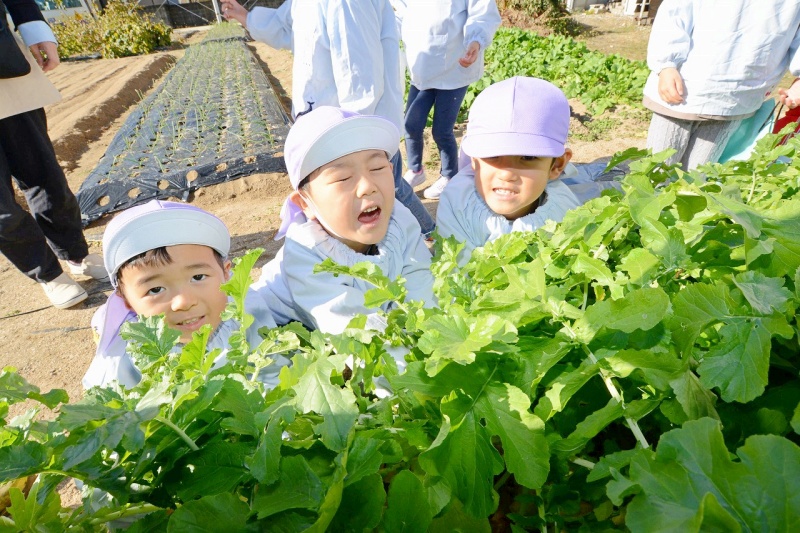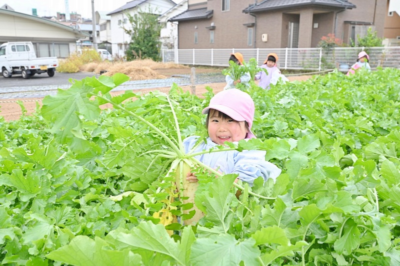 収穫した大根を手にした子どもたちは、「重たい〜!」「こんなに大きいのとれたよ!」と大喜び。 後日、「おでんにして食べたよ」「サラダにしたら美味しかった!」と、嬉しそうに話してくれる姿から、自分で収穫した野菜の味が、特別なものになったことが伝わってきました。