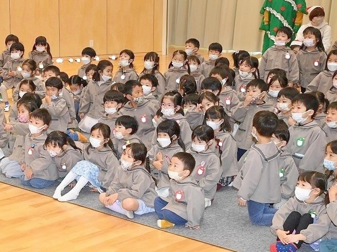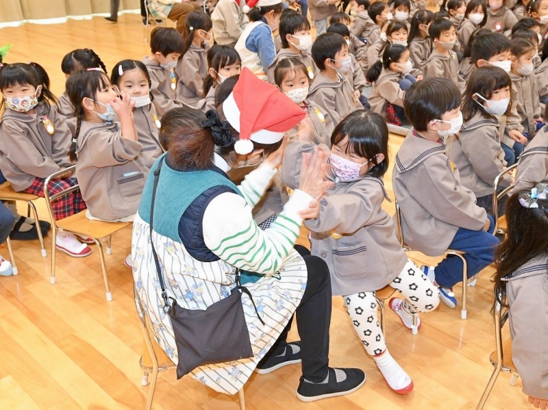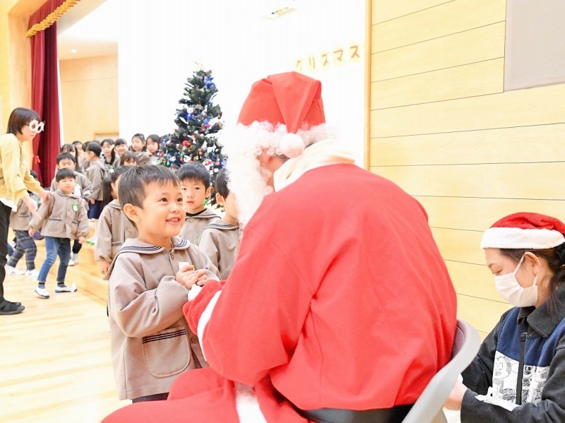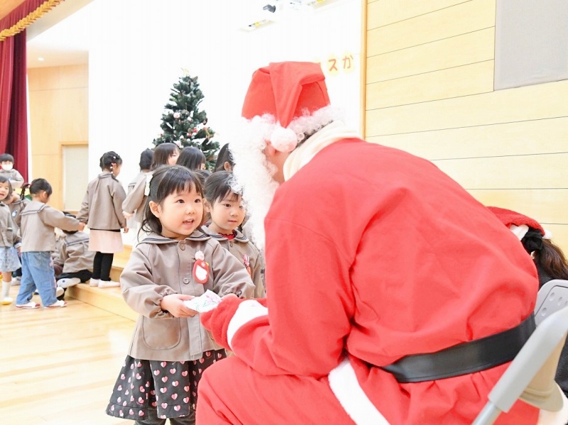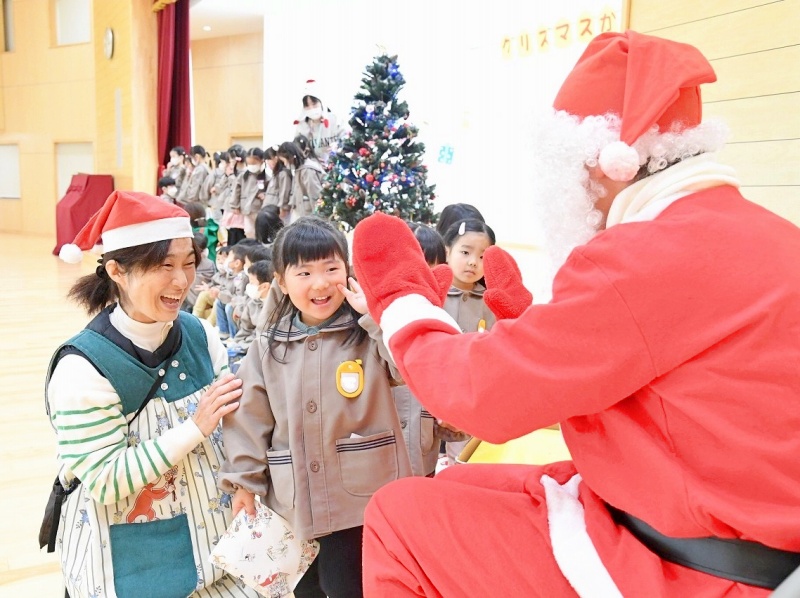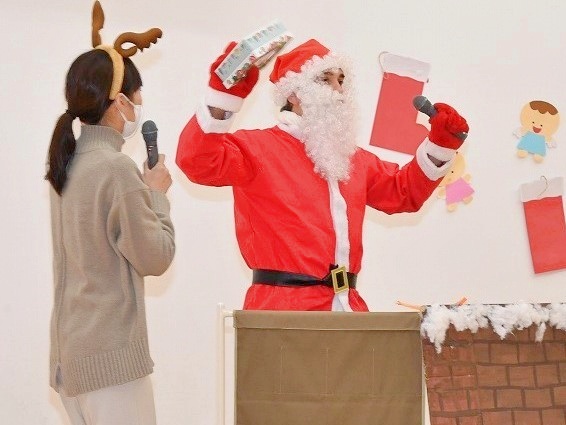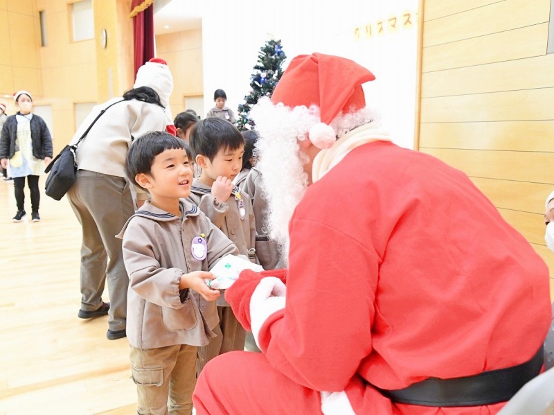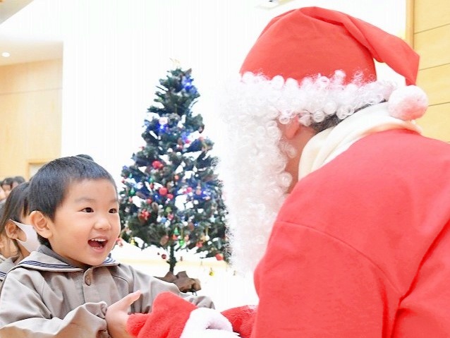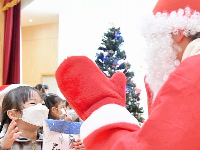クリスマス会では、イルミネーションの光が輝く中で職員が歌を披露し、「メリークリスマス!」のかけ声とクラッカーの音で会がスタート!みんなでクリスマスの歌を歌った後、先生からのお楽しみの劇を見ました。劇の中でトナカイと一緒にサンタさんを探していると・・・煙突の中から「Ho!Ho!Ho!」とサンタさんが登場!最初はびっくりして目が丸くなっていた子ども達でしたが、「サンタさんだ~!」と喜びの声と笑顔が見られました♡その後は、子ども達からの質問に答えてもらったり、サンタさんと一緒に写真を撮ったり、プレゼントをもらったりして楽しい時間を過ごしました💓