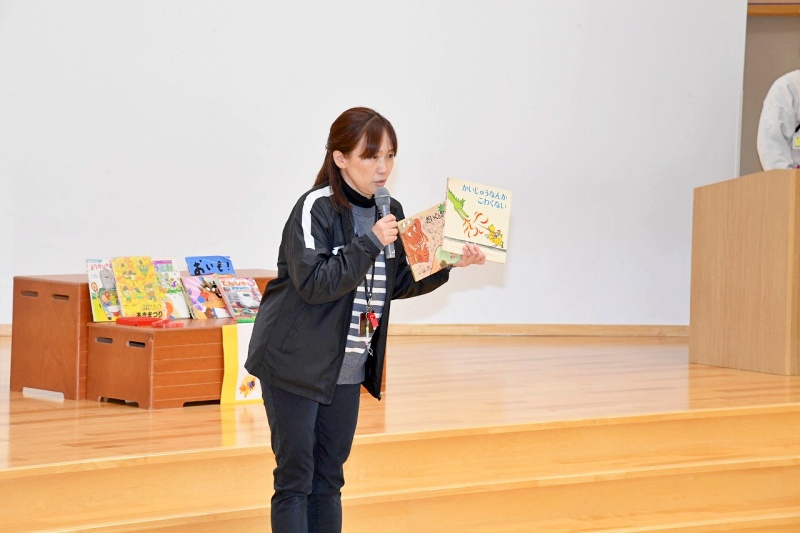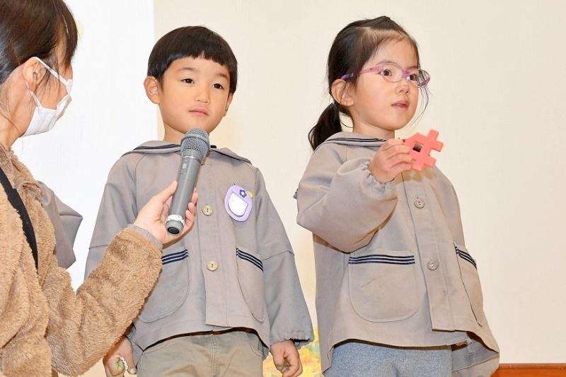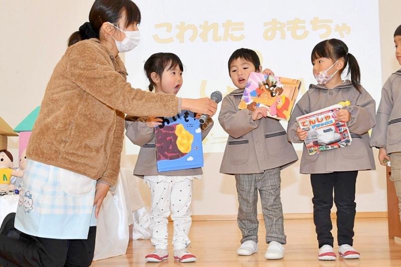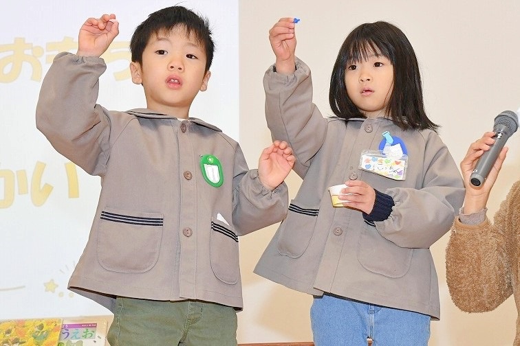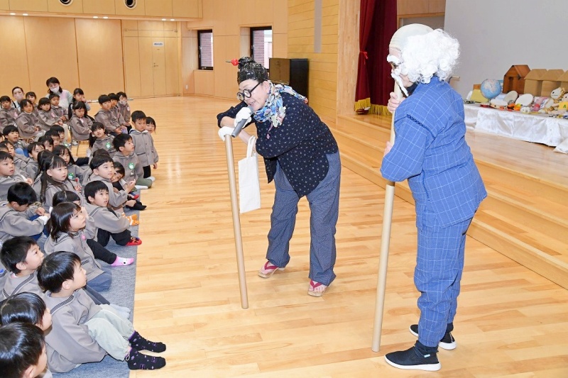 そして、昨年度に引き続き、「もったいないばあさん」と「もったいないじいさん」が登場!子ども達が取り組んできた「片付けカレンダー」を見てもらったり、壊れたものも直したらまた使えることを教えてもらったりしました。子ども達はお二人の話を真剣に聞き、おもちゃを大切に使ったり、丁寧に片付けたりすることなどを約束しました。