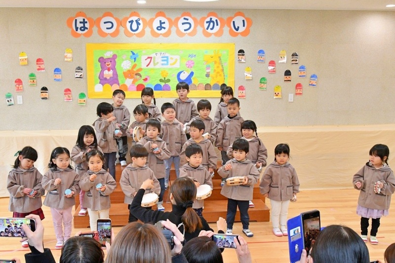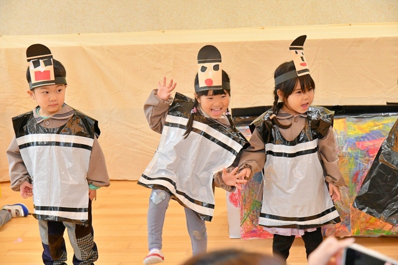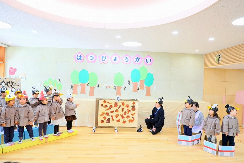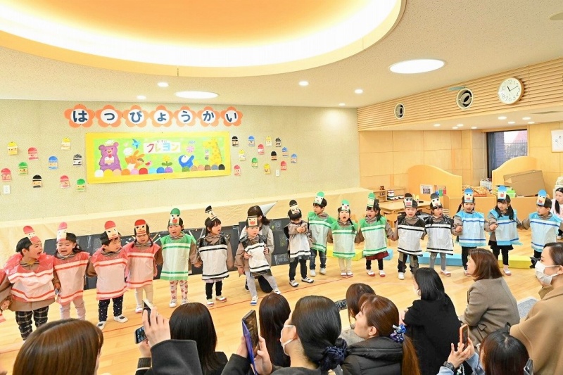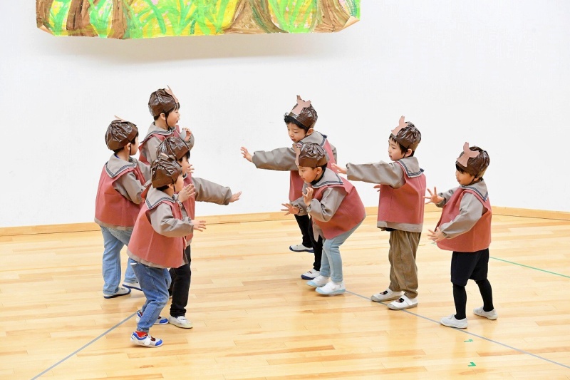 年少組にとっては今回が初めての発表会。緊張せず、日頃からのびのびと楽しんでいる表現遊びの姿をそのまま感じていただきたいという思いから、各保育室で発表を行いました。それでも本番になると、張り切ったり恥ずかしくなったり、胸がドキドキしたり……さまざまな表情を見せてくれるのが年少さんらしいところです。いつもとは少し違う雰囲気に戸惑いながらも、おうちの方を前にしっかりと頑張る姿を見せてくれました (^_^)