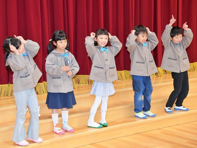 2階遊戯室で行われた年中・年長組の誕生会では、年長そら組5名が司会と出し物を担当しました。手遊び「つのつの つ~の」では、会場の子ども達も一緒になって歌ったり動いたりして、大変盛り上がりました♡