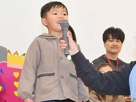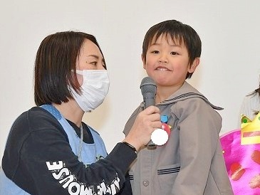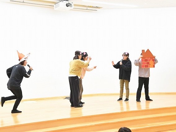 この日を「まだかな?」と心待ちにしていた3月生まれの子どもたち。ついに自分たちがお祝いしてもらえる番になり、本当に嬉しそうな表情を見せてくれました。2階遊戯室では、司会の子どもたちが「かける」と書いたカードをもち、言葉探しをするゲームをしたり、職員が英語劇「3匹のこぶた」を開いて発表したりと、大変盛り上がりました。