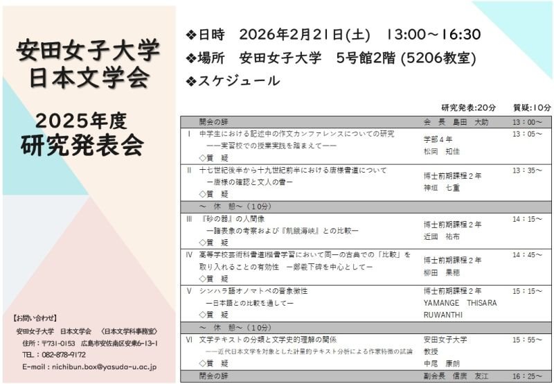 安田女子大学日本文学会 研究発表会開催のお知らせ