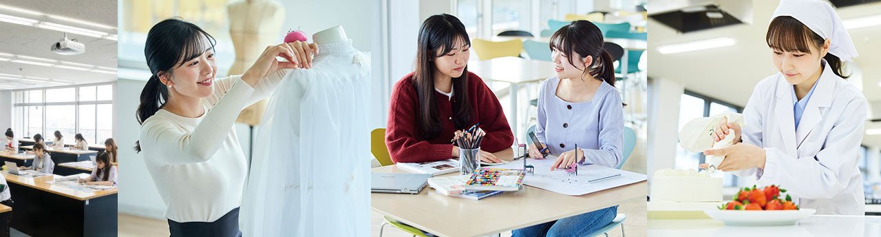 実際に染色を行いながら染料と布の関係を体感する「染色加工学実験」(衣分野)、広島の有名パティシエから製菓技術を学ぶ「コンフェクショナリー実習」(食分野)、「リビングデザイン」「エクステリアデザイン」(住分野)など、実践的な学びを幅広く展開しています。