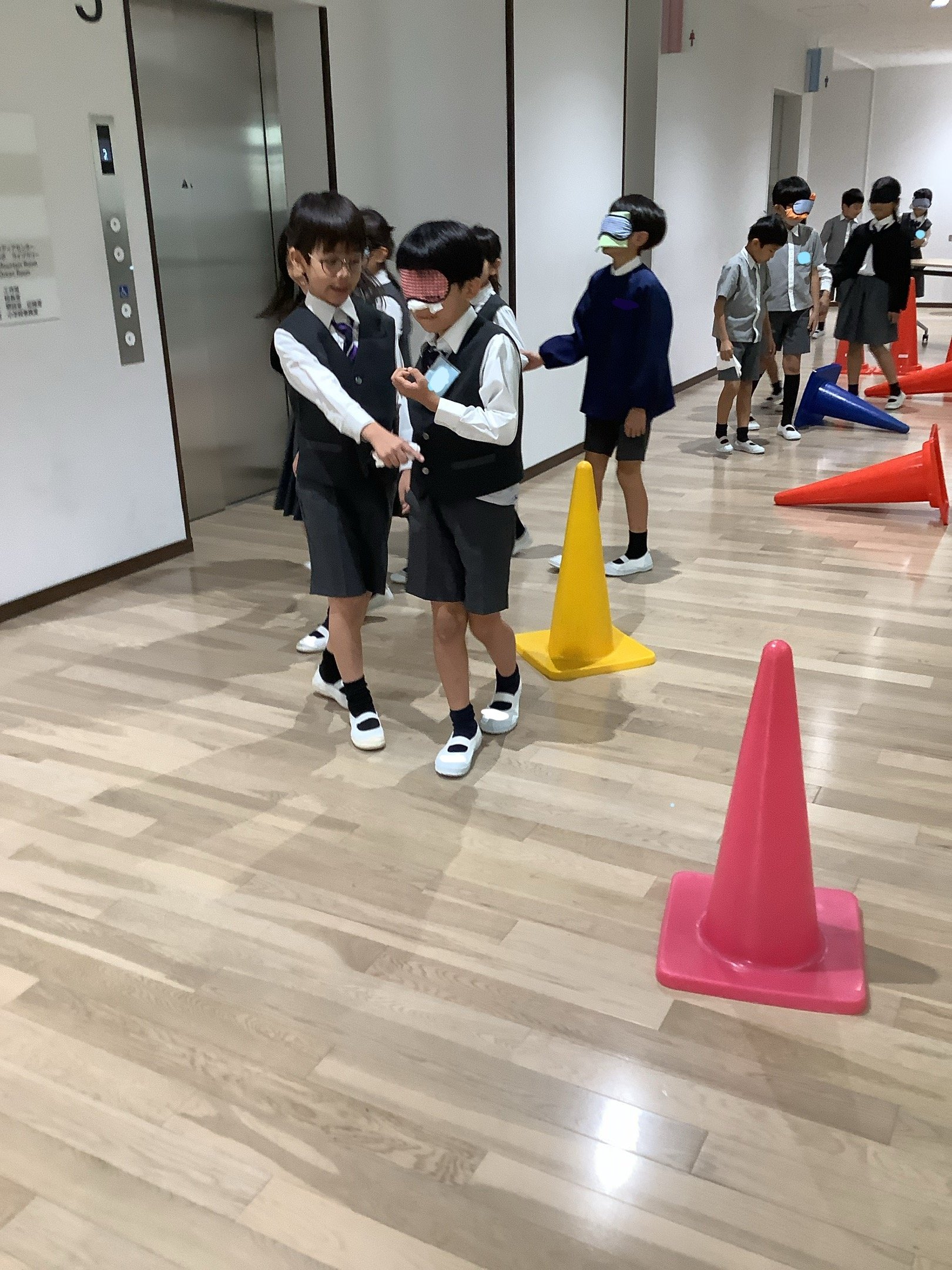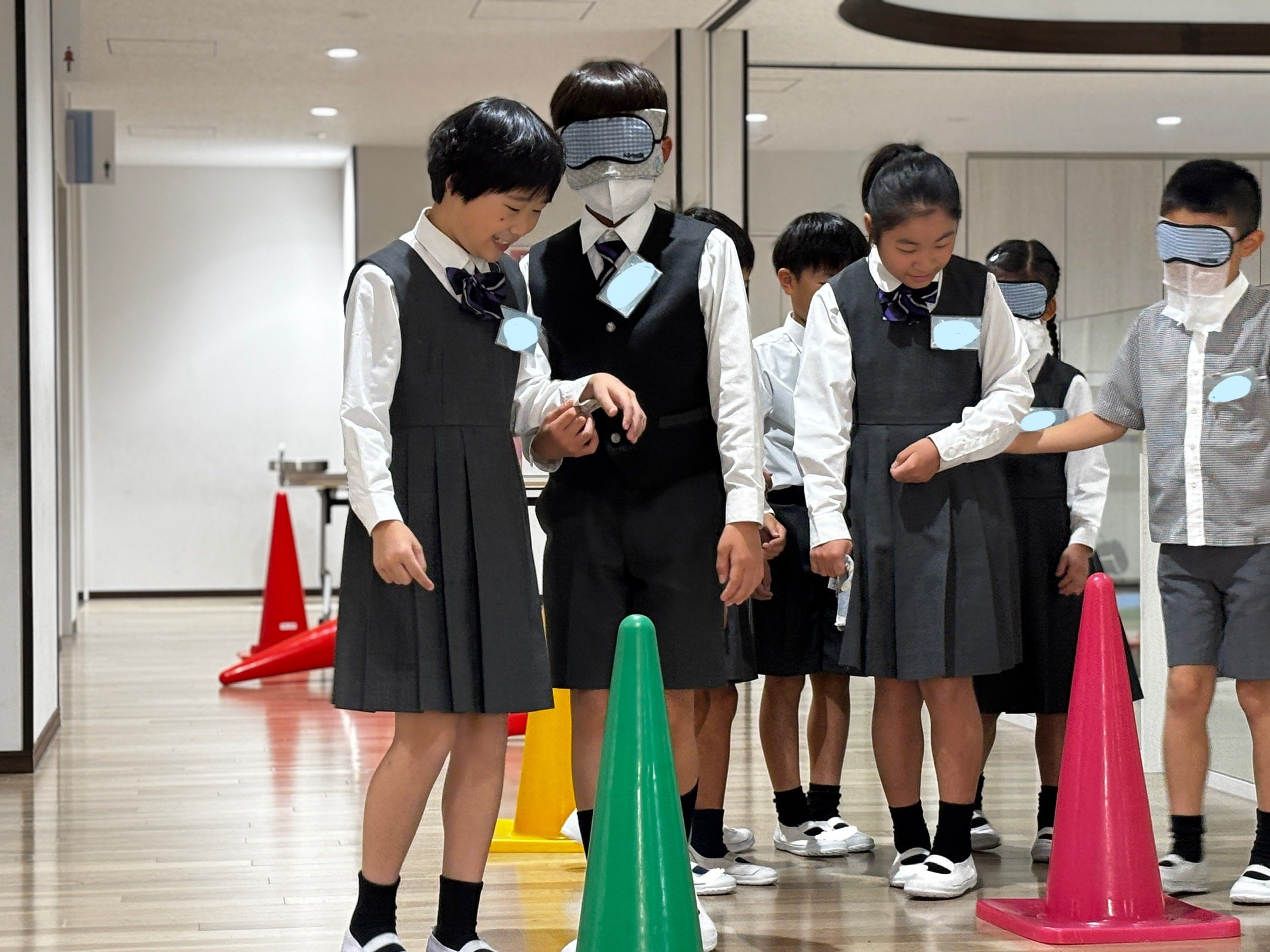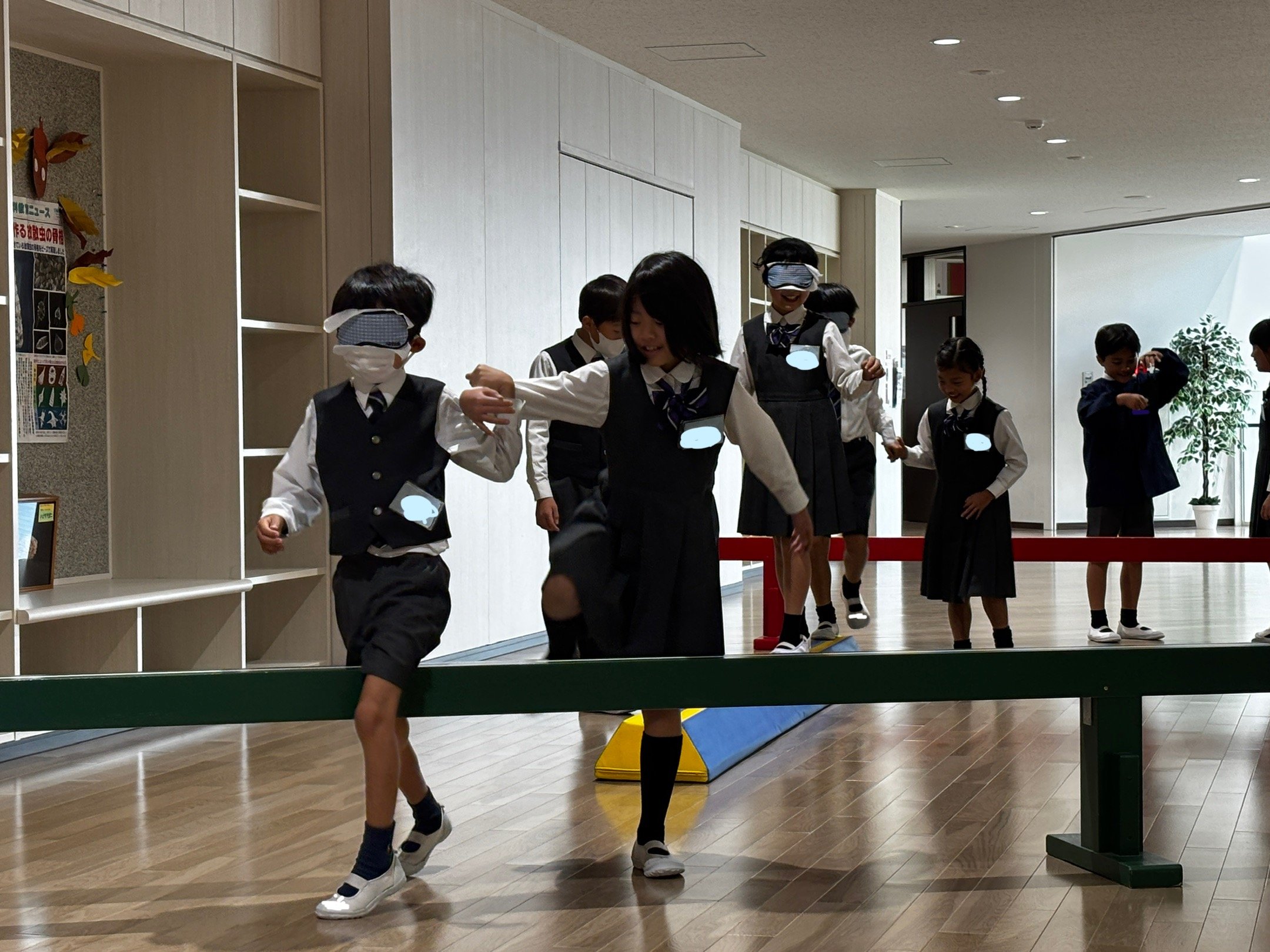 「ブラインドウォーク」とは、目の見えないことを体験し、もう一人がガイド役となり行動するものです。廊下に平均台やマット、コーンを設置し、坂道や段差、細い通路などに見立てて、体験しました。アイマスクをして歩く子どもたちは、方向感覚を失い、大きな不安に襲われた様子でした。ガイド役の子どもたちは、自分たちなりに考えてこまめに声をかけ、歩くスピードなども試行錯誤していました。