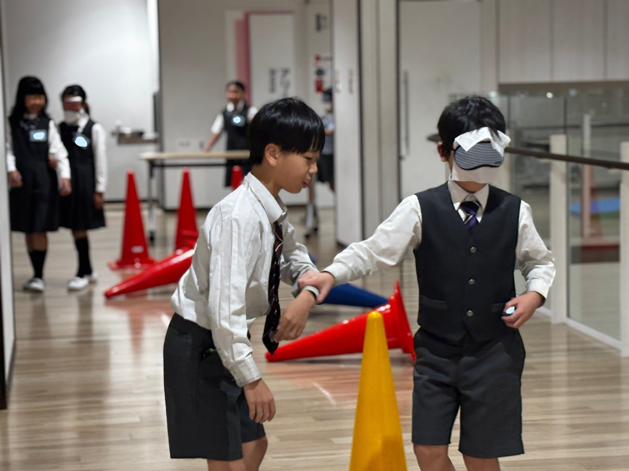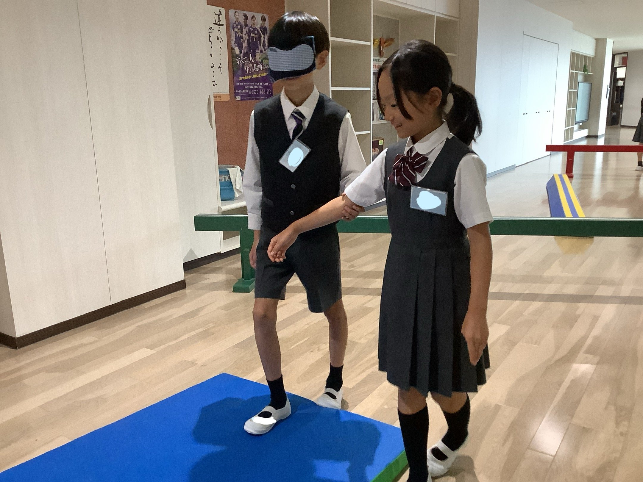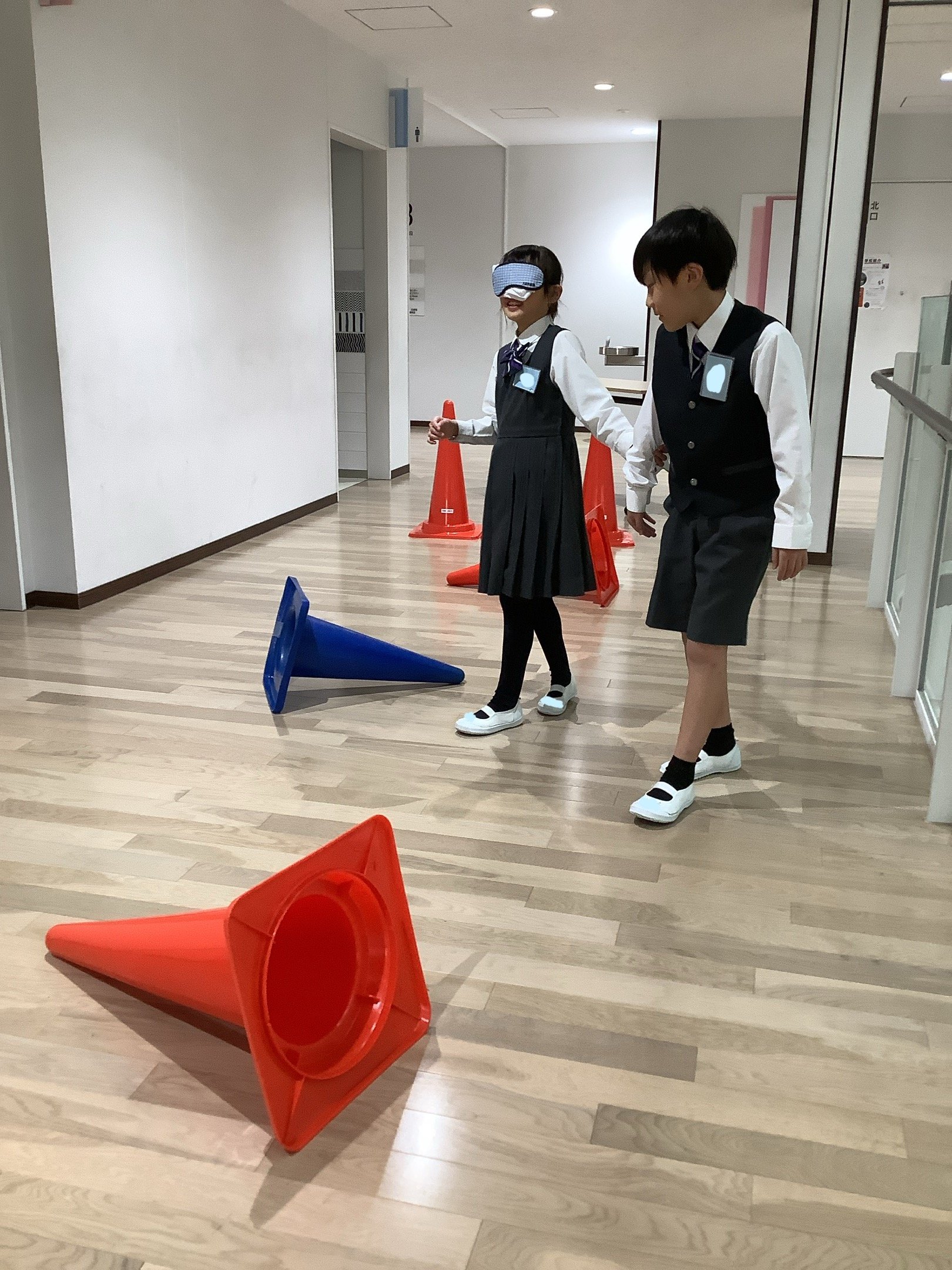 「ブラインドウォーク」とは、目の見えないことを体験し、もう一人がガイド役となり行動するものです。廊下に平均台やマット、コーンを設置し、坂道や段差、細い通路などに見立てて、体験しました。アイマスクをして歩く子どもたちは、方向感覚を失い、大きな不安に襲われた様子でした。ガイド役の子どもたちは、自分たちなりに考えてこまめに声をかけ、歩くスピードなども試行錯誤していました。