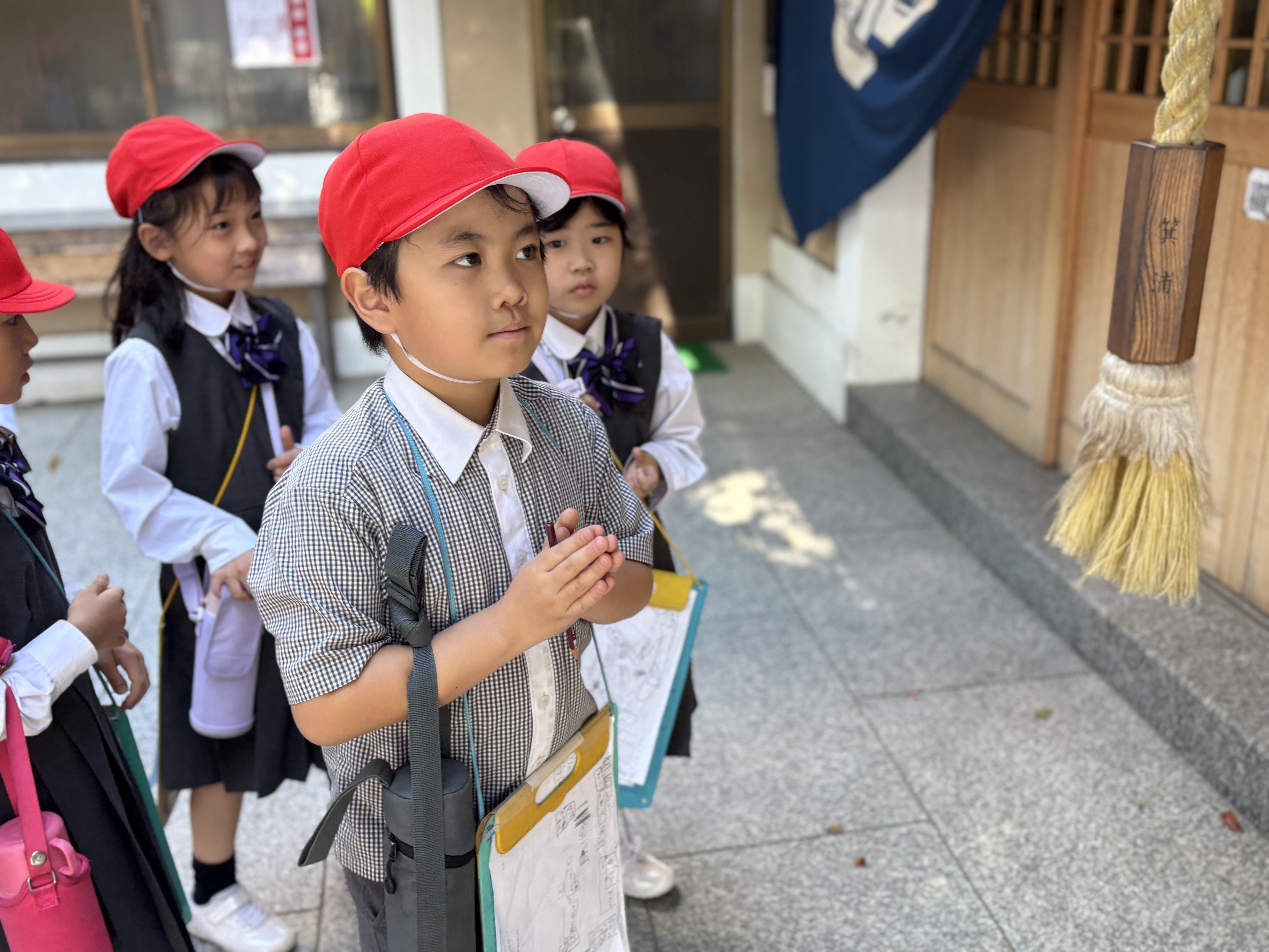 まず、くすのきテラス(屋上)から学校のまわりを見渡し、どんなものがあるかをみんなで探しました。その後、2日に分けて学校のまわりを探検しました。1回目は西門から出発し、「新こうへい橋」を渡って本川沿いを歩き、ホームテレビや上野学園ホールなどを見つけました。