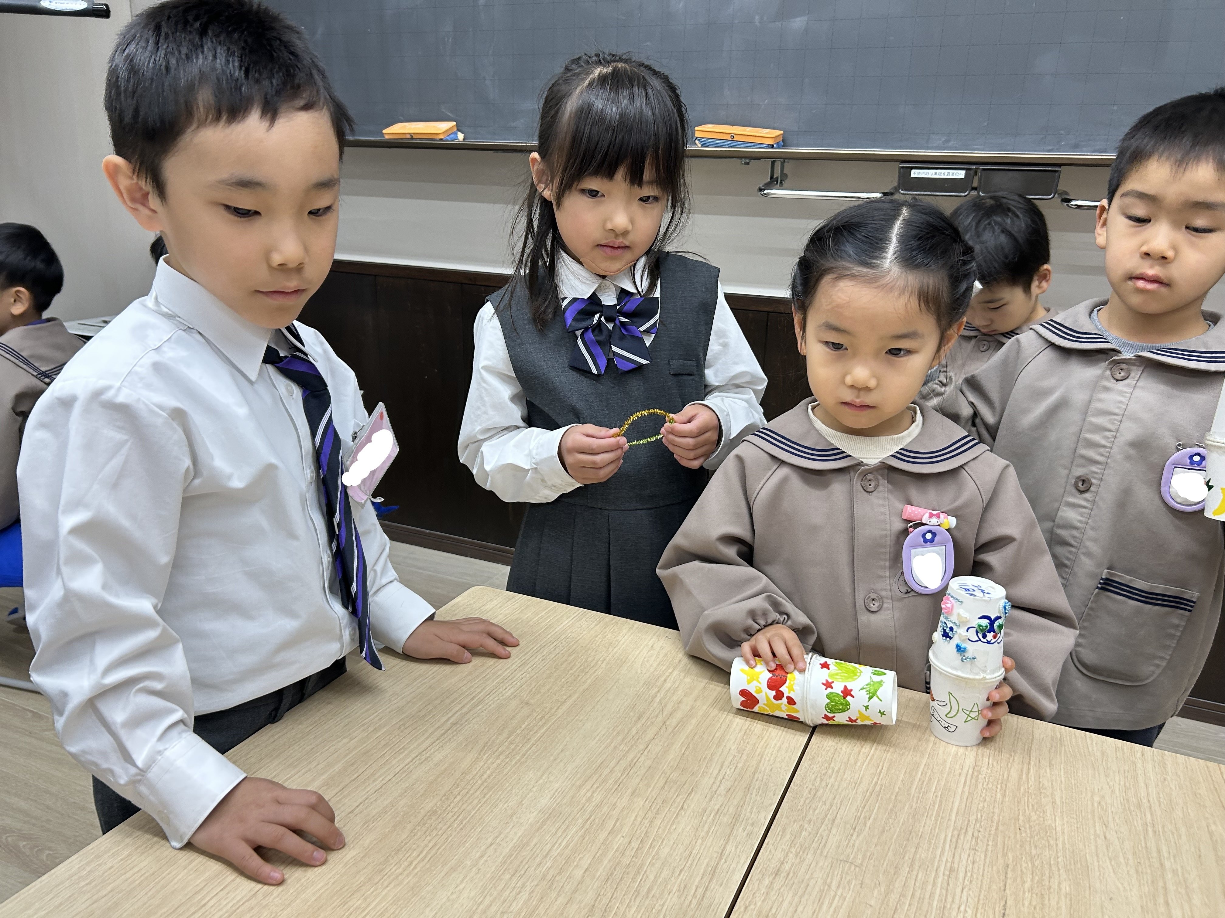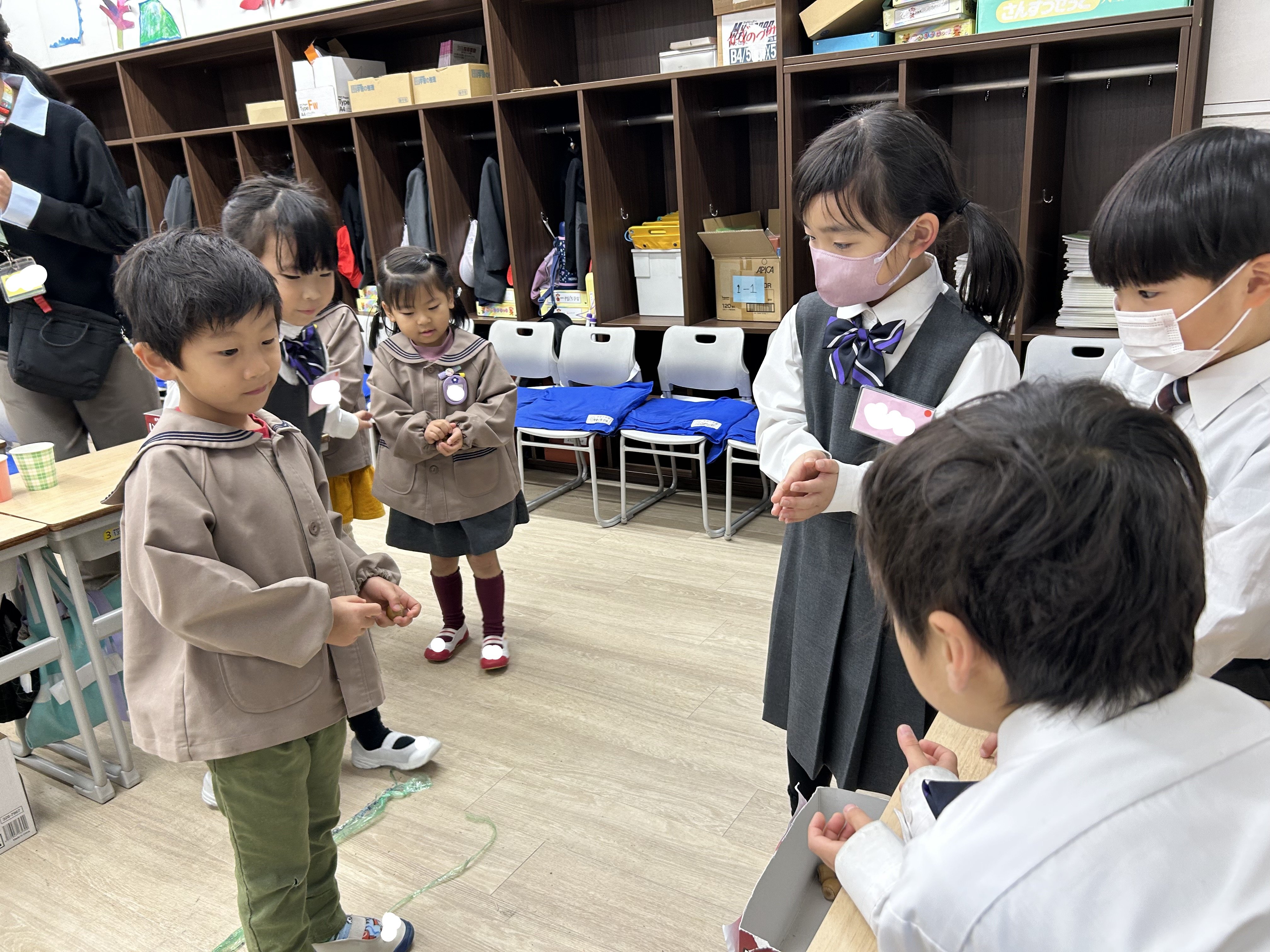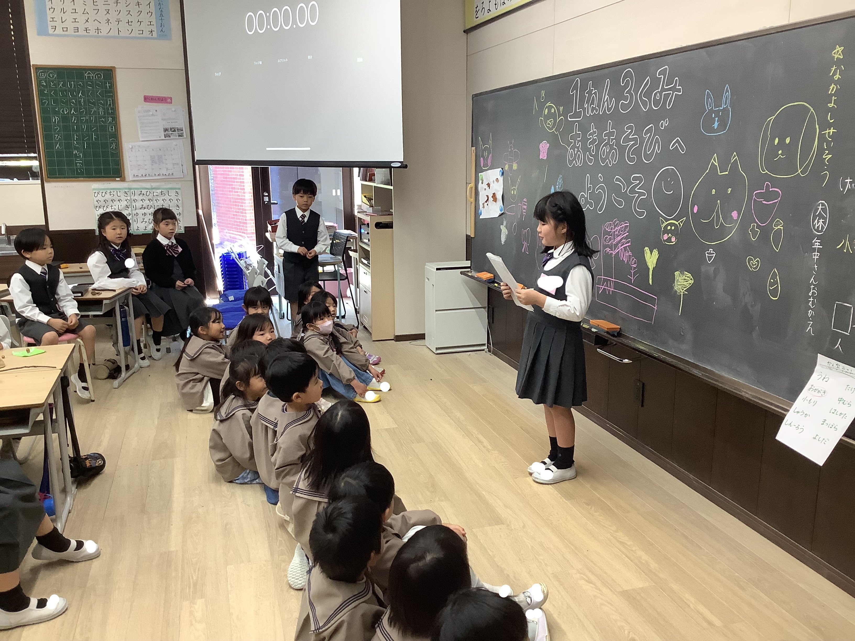 その学習の集大成として、安田幼稚園の年中児さんを招待して、「あきまつり」を開きました。年中児さんを招待するために1年生は、楽しんでもらうために何度も遊びを試行錯誤し、説明の仕方や役割分担についてもみんなで話し合いながら準備してきました。当日は、優しく声をかけたり、遊びの手本を見せてあげたり、1年生として頼もしい姿がたくさん見られました。