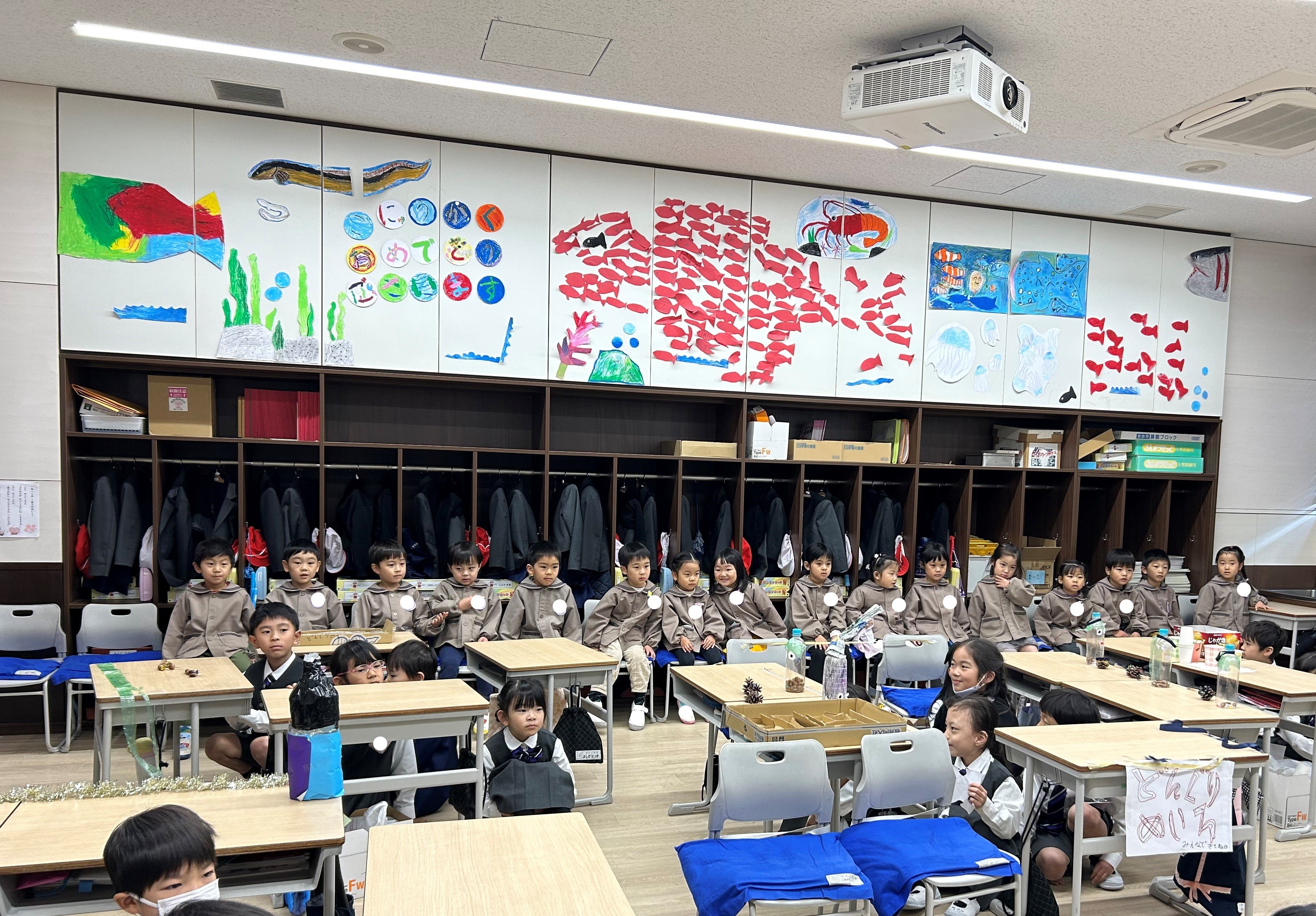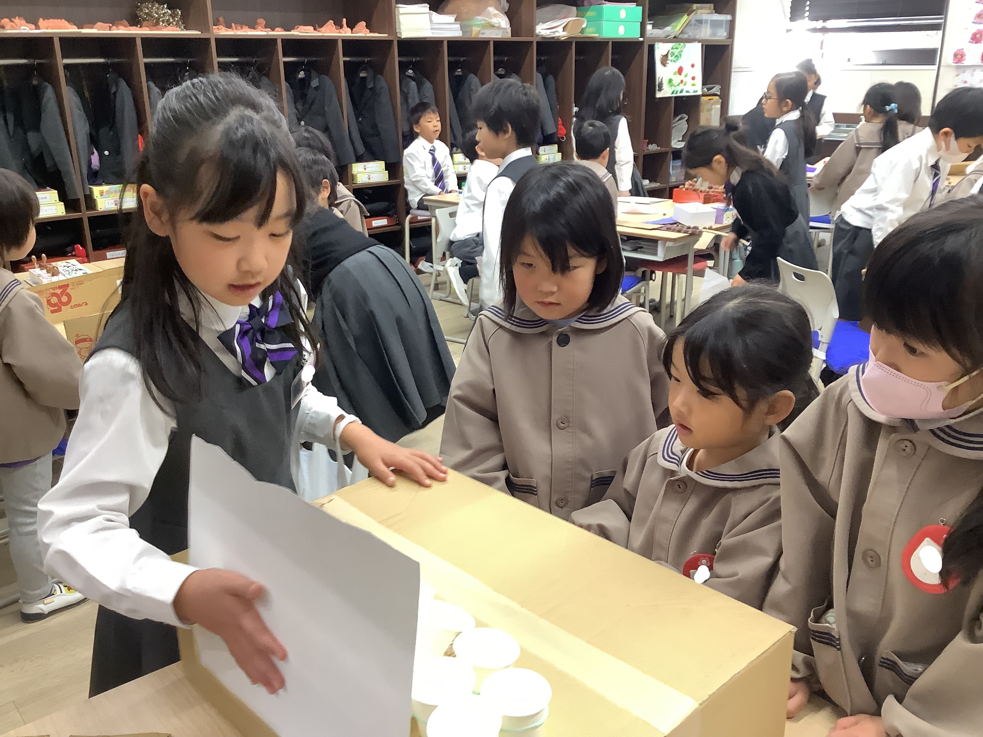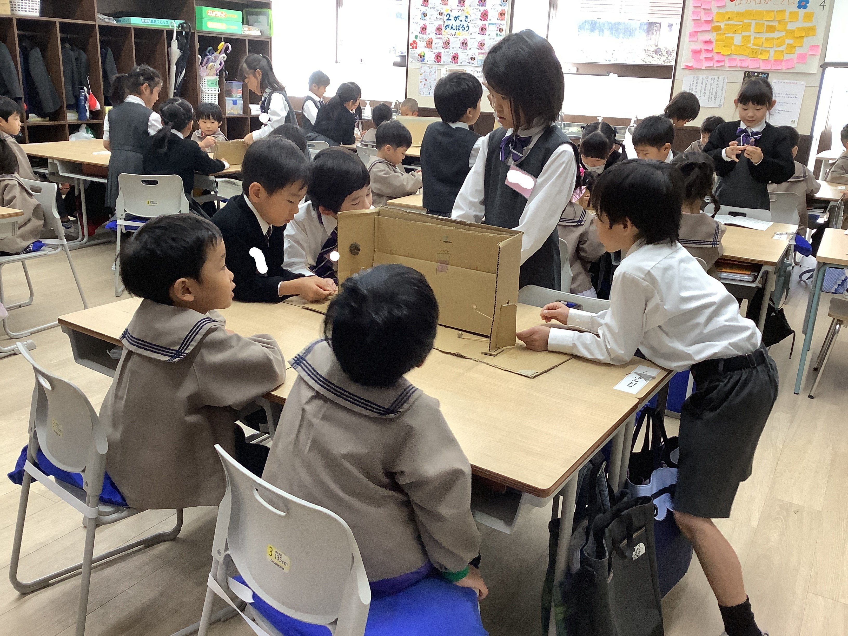 その学習の集大成として、安田幼稚園の年中児さんを招待して、「あきまつり」を開きました。年中児さんを招待するために1年生は、楽しんでもらうために何度も遊びを試行錯誤し、説明の仕方や役割分担についてもみんなで話し合いながら準備してきました。当日は、優しく声をかけたり、遊びの手本を見せてあげたり、1年生として頼もしい姿がたくさん見られました。