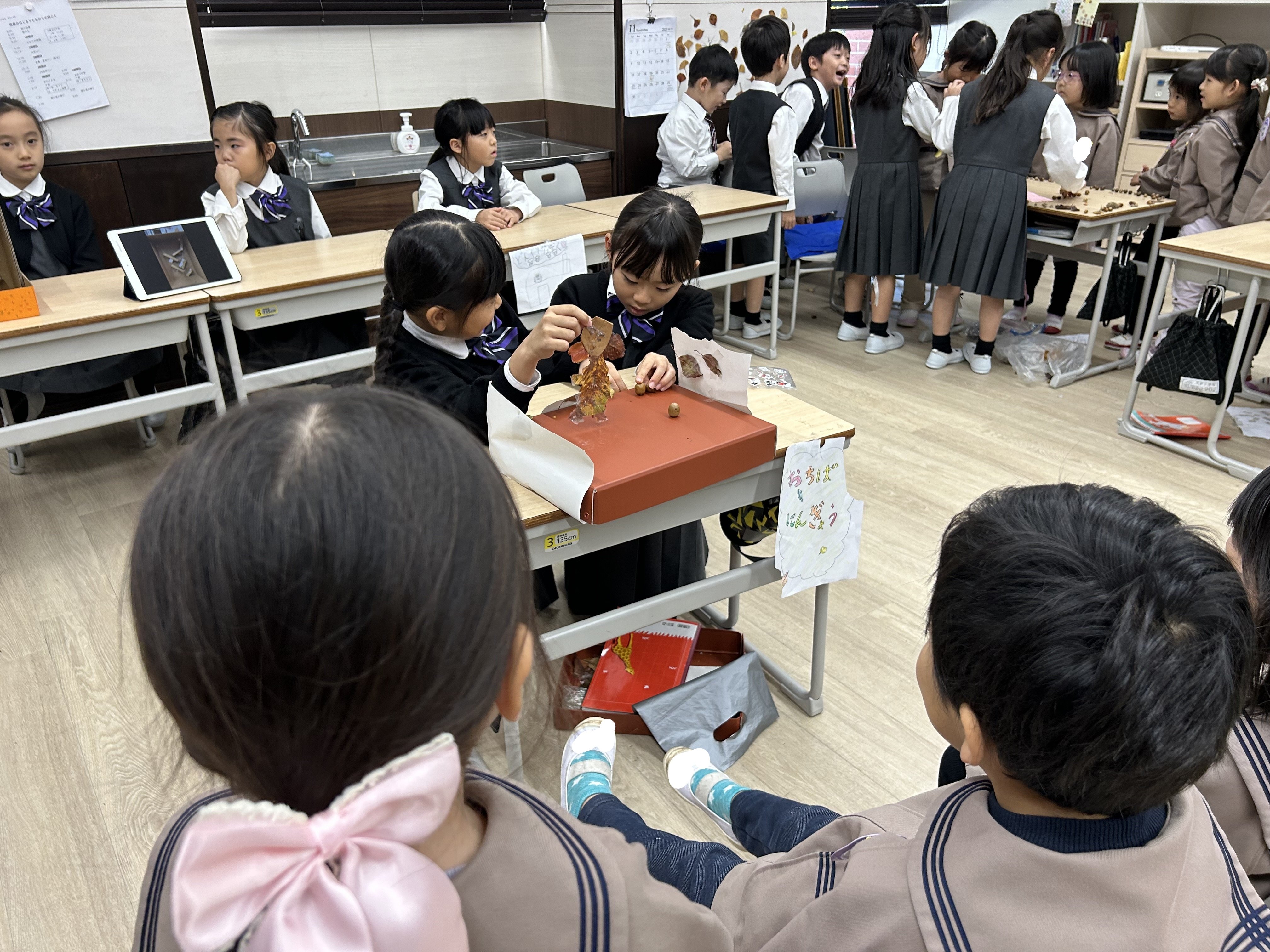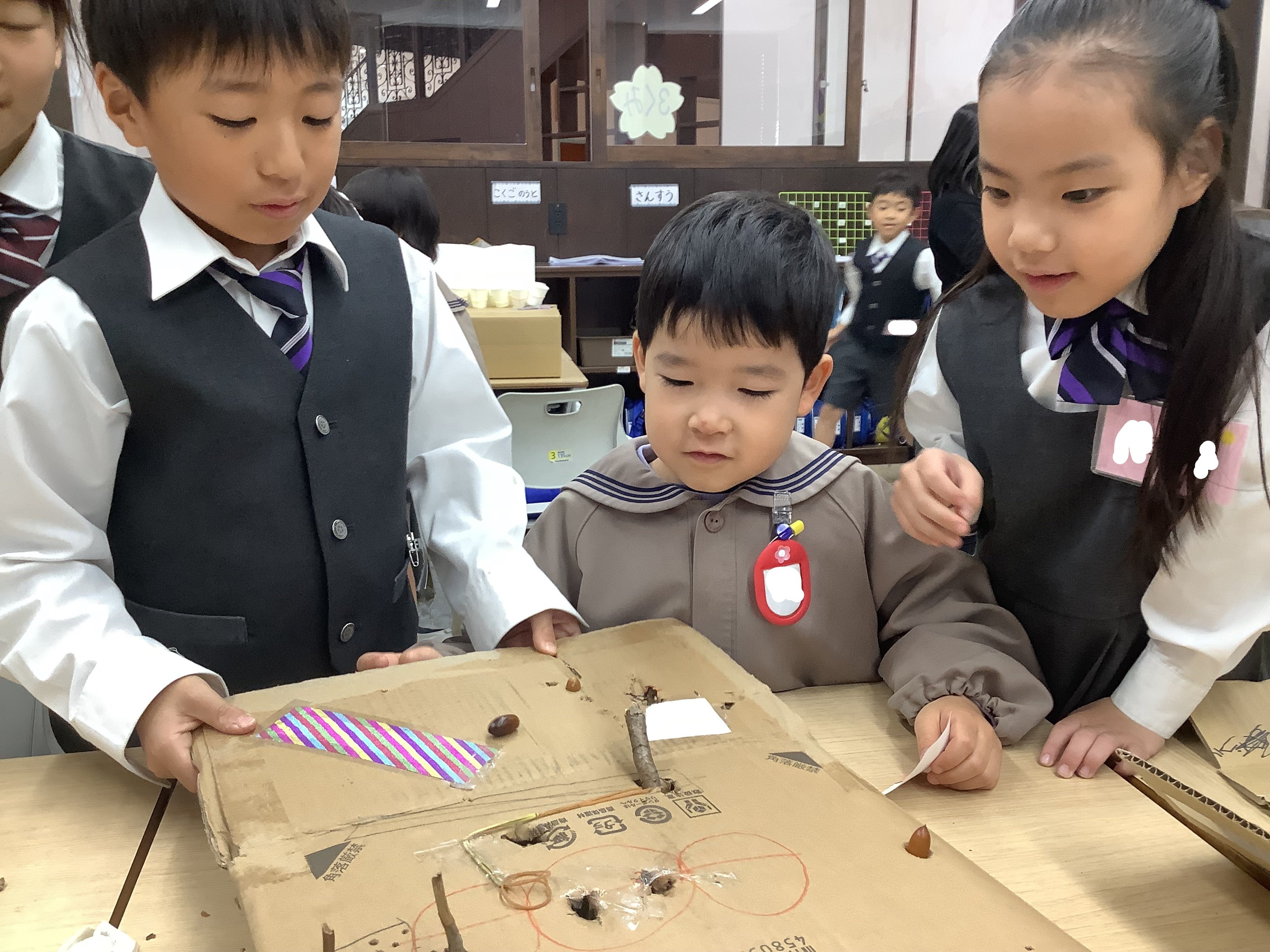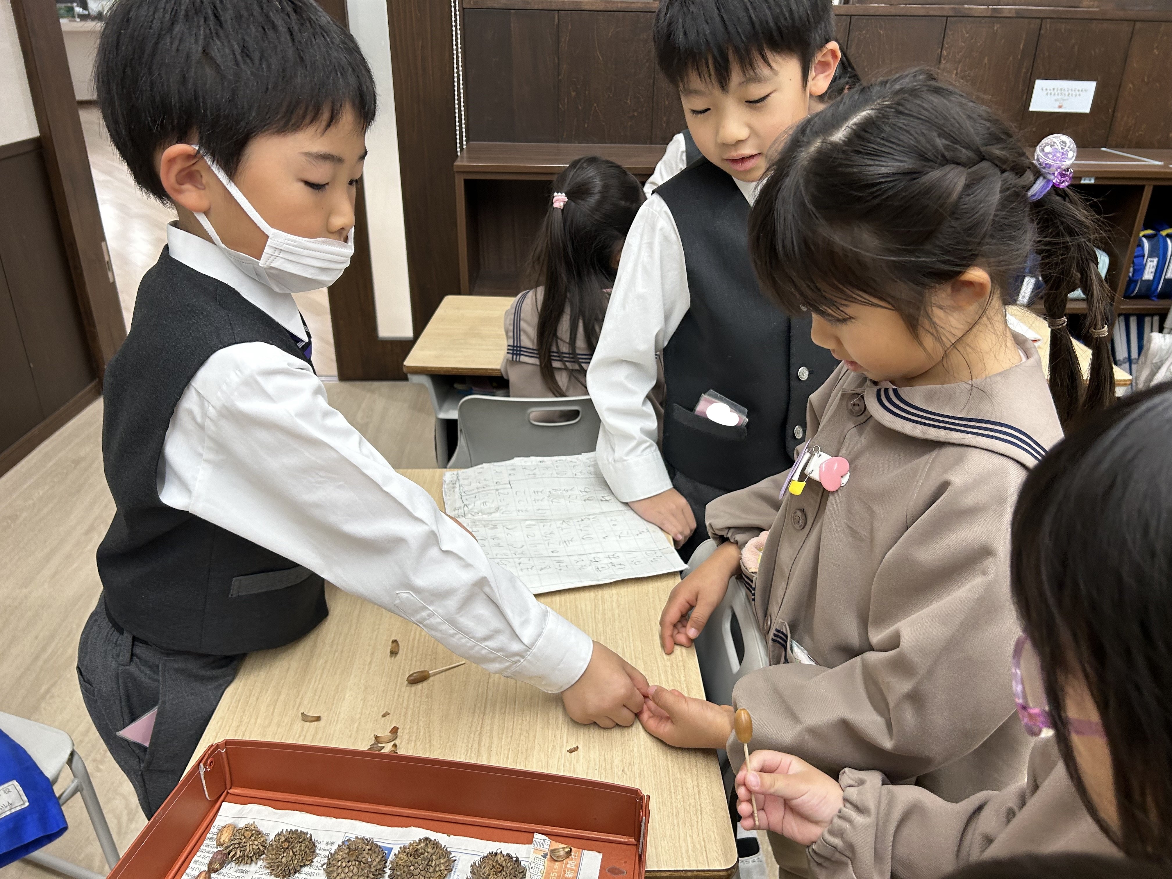 1年生のくすのきでは、「あきとともだち」という学習をしています。この学習は、秋の自然を使った遊びを創造し、季節に親しみながら遊びを探究していくことを目的としています。