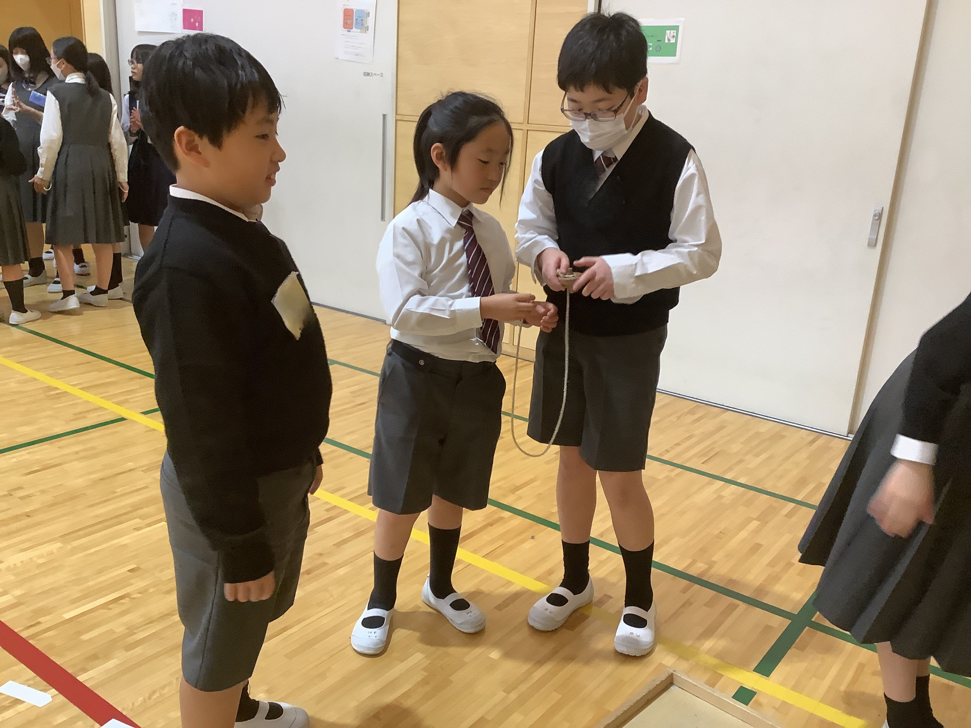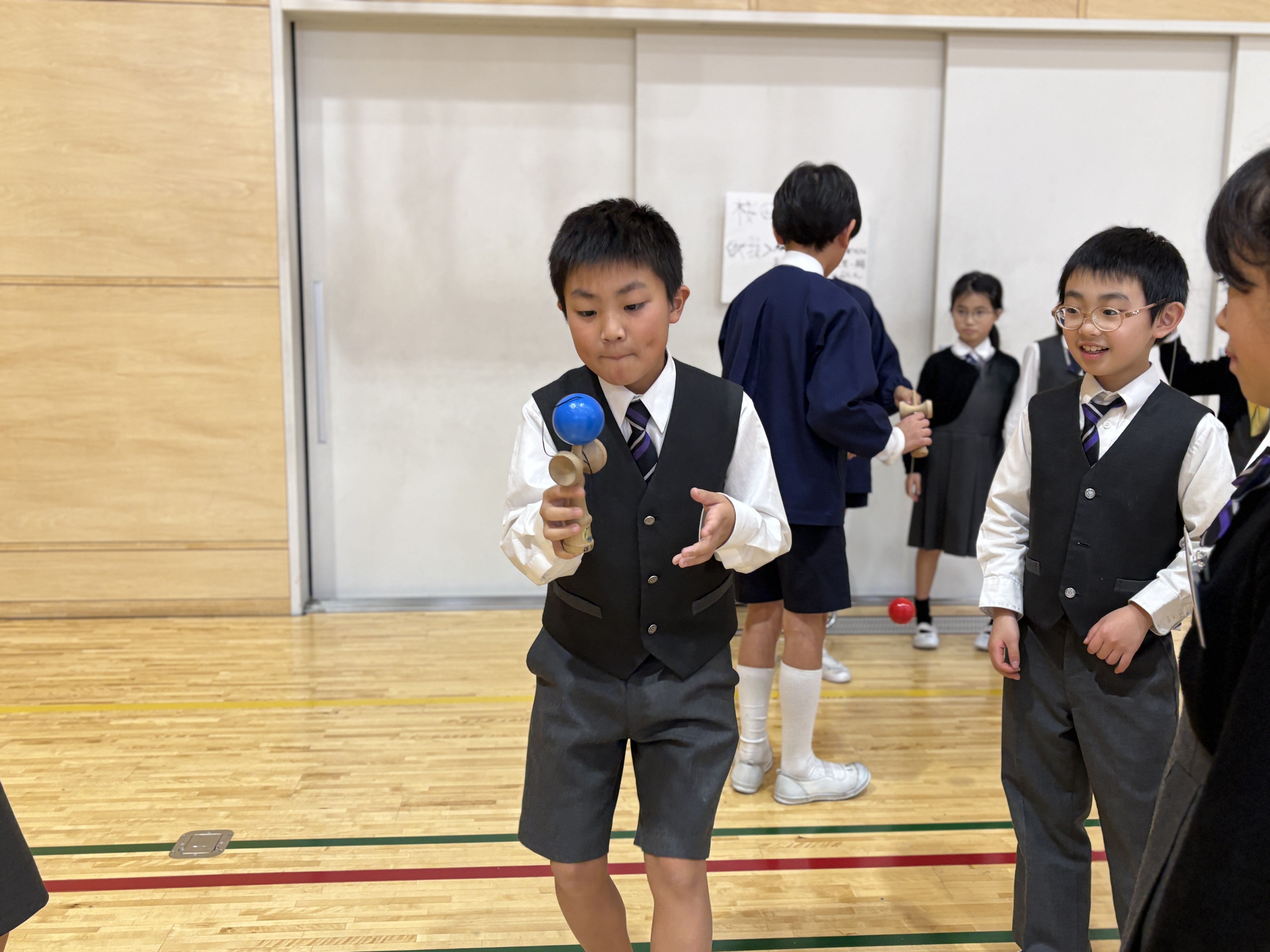 2年生のくすのきの学習で、自分たちの遊びを広げるために、普段自分がしている遊びと昔からある伝統的な遊びのそれぞれの良いところについて考えました。すでに、昔遊びを経験している5年生は、2年生に自分の技を見せるためにこの日までたくさん練習をしてきました。授業の中では、技をみた2年生が「すごい!」と言ったり、教えてあげる5年生が「上手だね。」と声をかけてあげたりする声が聞こえてきて、温かい雰囲気で交流を楽しみました。2年生は今日体験したお手玉、けん玉、あやとり、こまの中から一つを選んで、これからの授業で練習をしていきます。どんな技をきわめていくか楽しみです。