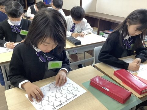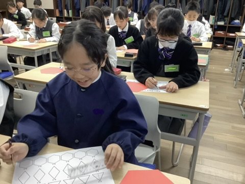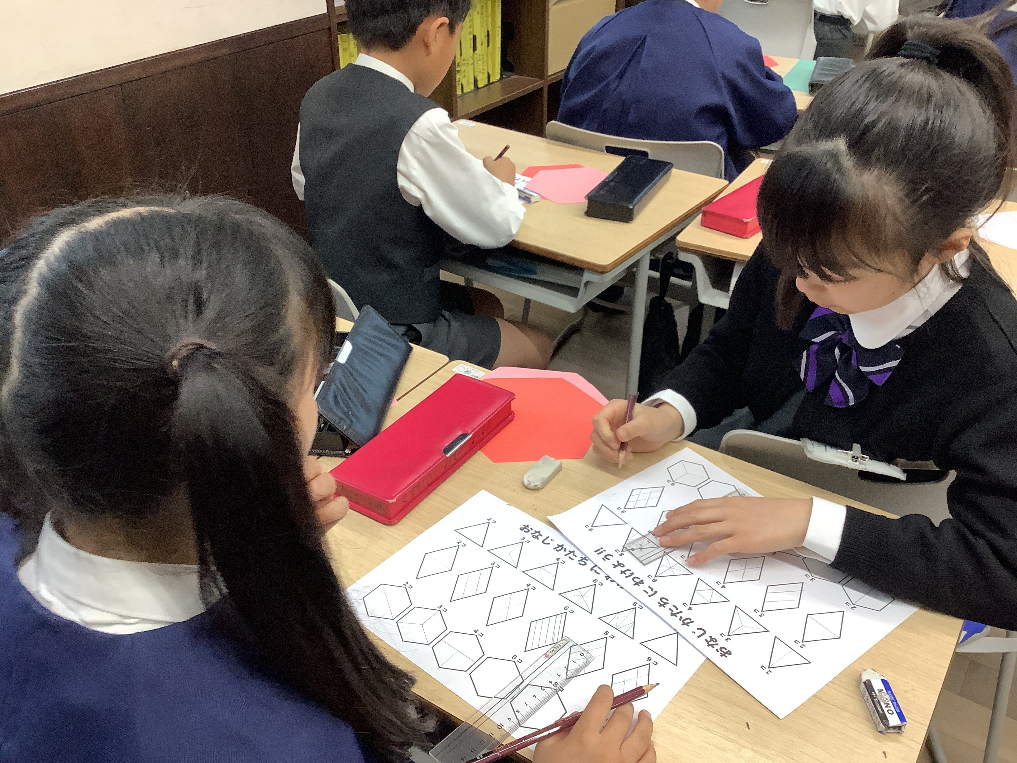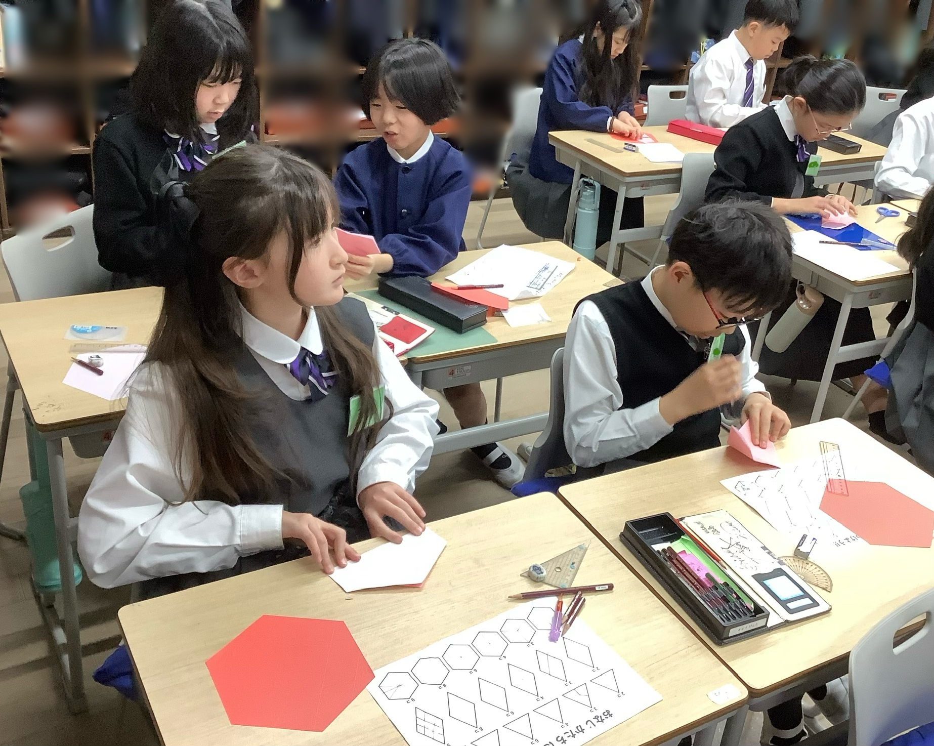 授業のテーマは「形のふしぎ」➡のような形はすきまなく敷き詰めることができるのか?という問いからスタートし、図形の特徴に注目しながら、みんなで予想し、考えました。「できそうかな?」「あれ、うまくいかない?」笑いあり、発見ありの展開に子どもたちはぐんぐん引き込まれていきました。