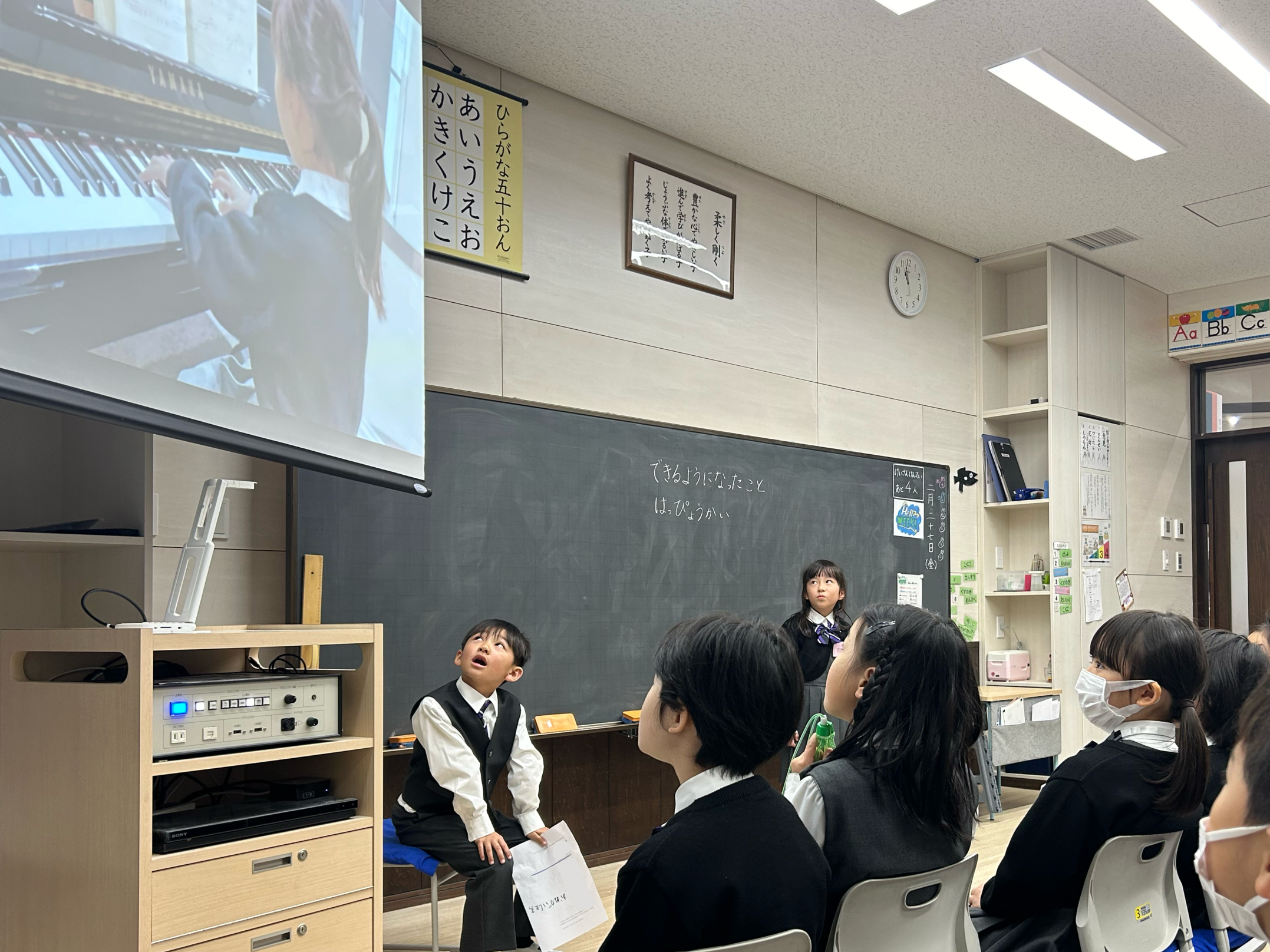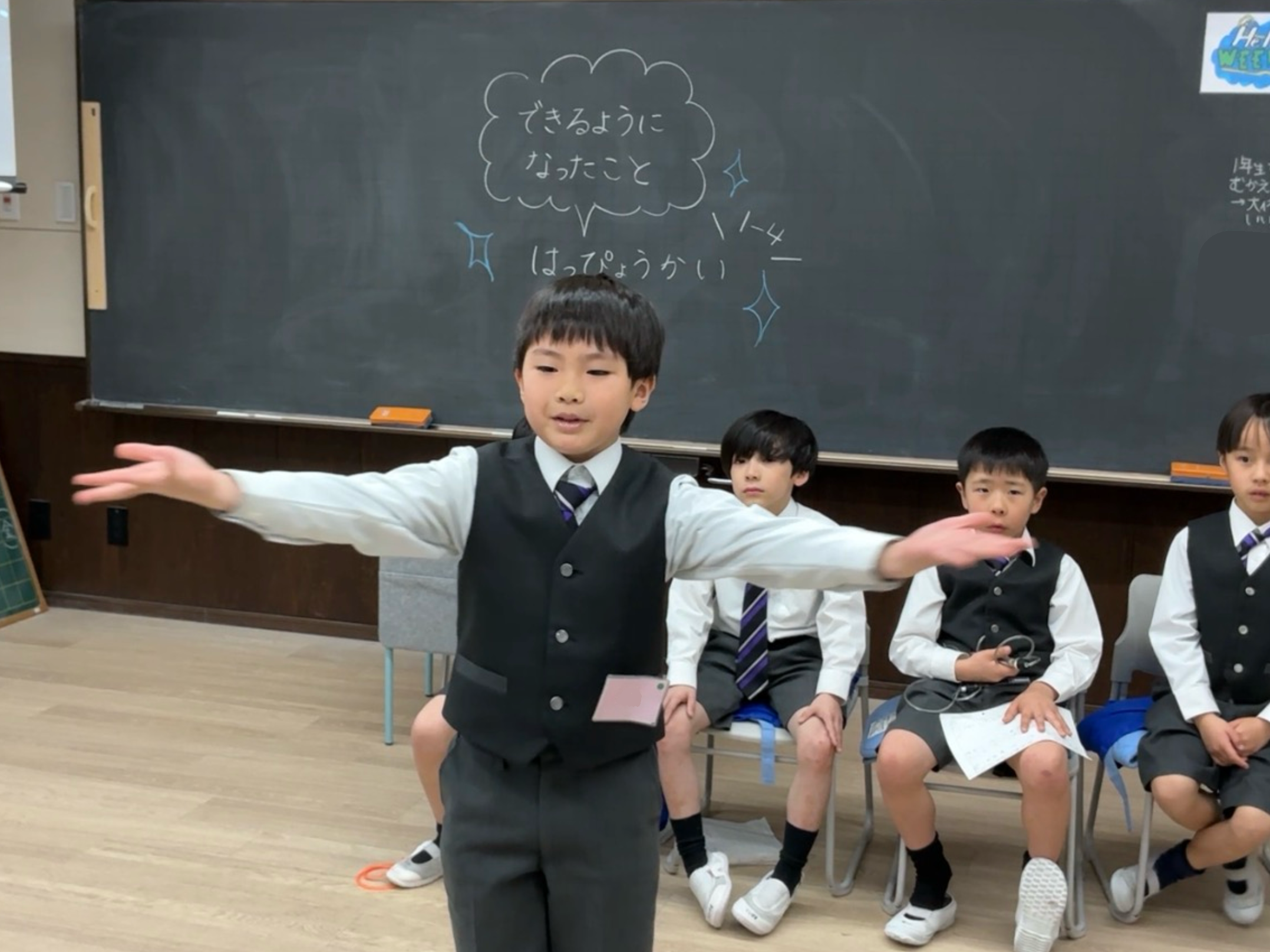 1年生はくすのきの学習の中で、自分の一年間の成長を振り返るもうすぐ2年生という単元に取り組んでいます。努力を続け、練習を積み重ねることでできることを増やしていった1年生。その集大成として、「できるようになったこと発表会」を開催しました。「苦手な食べ物を食べられるようになった」、「あやとびができるようになった」など、一人ひとりが成果を披露し、それを学級皆で認め合う、あたたかい時間になりました。