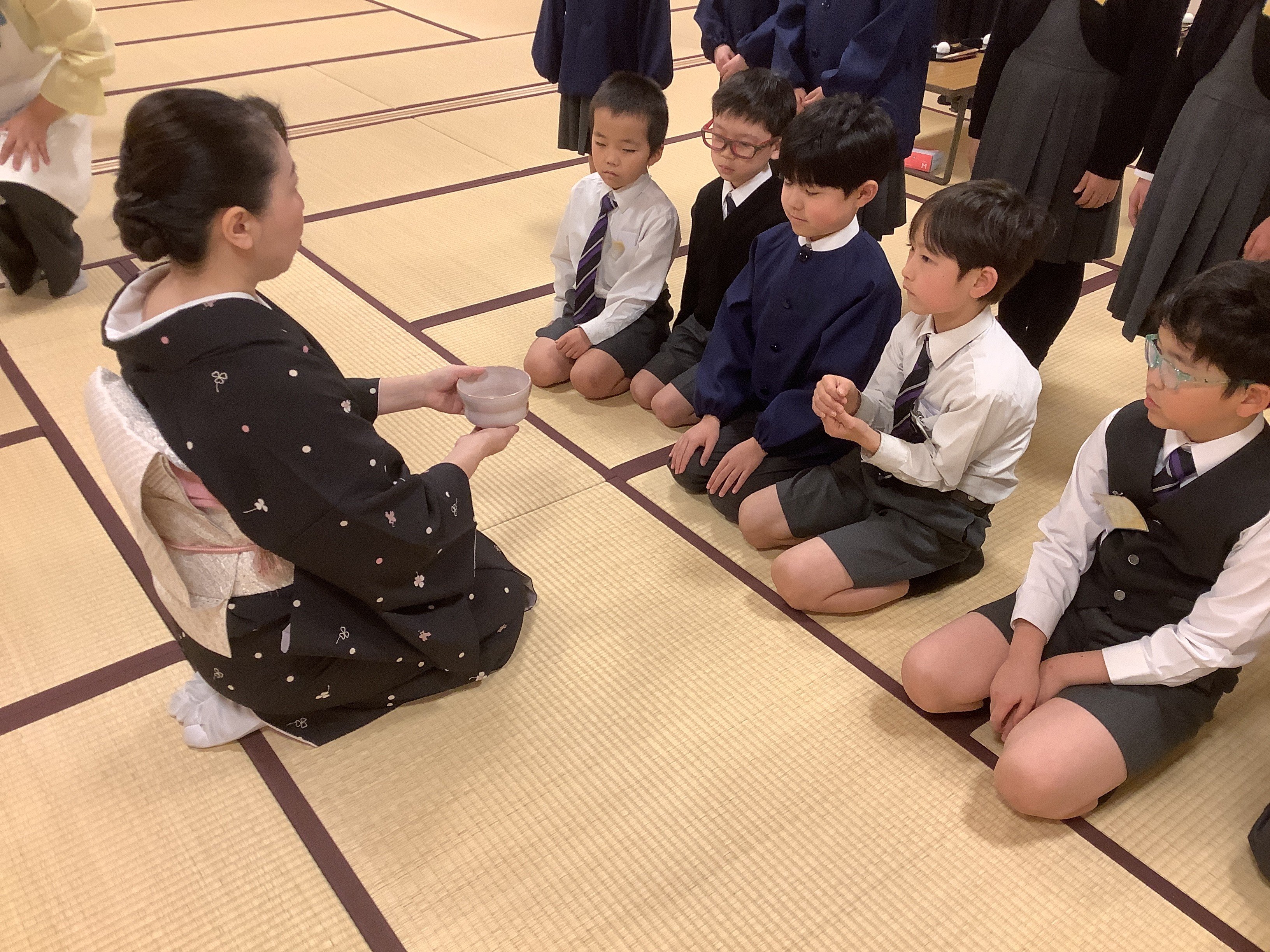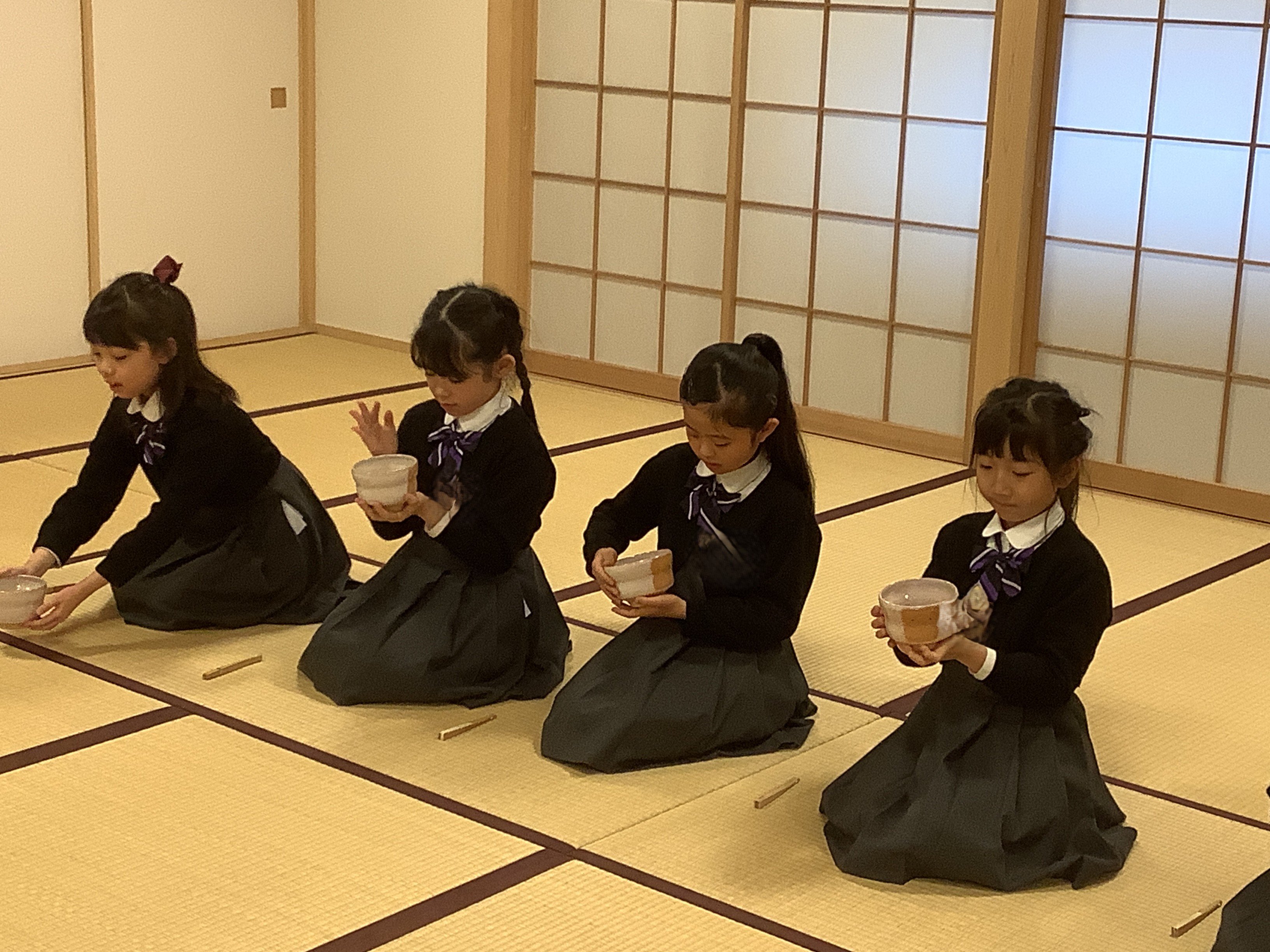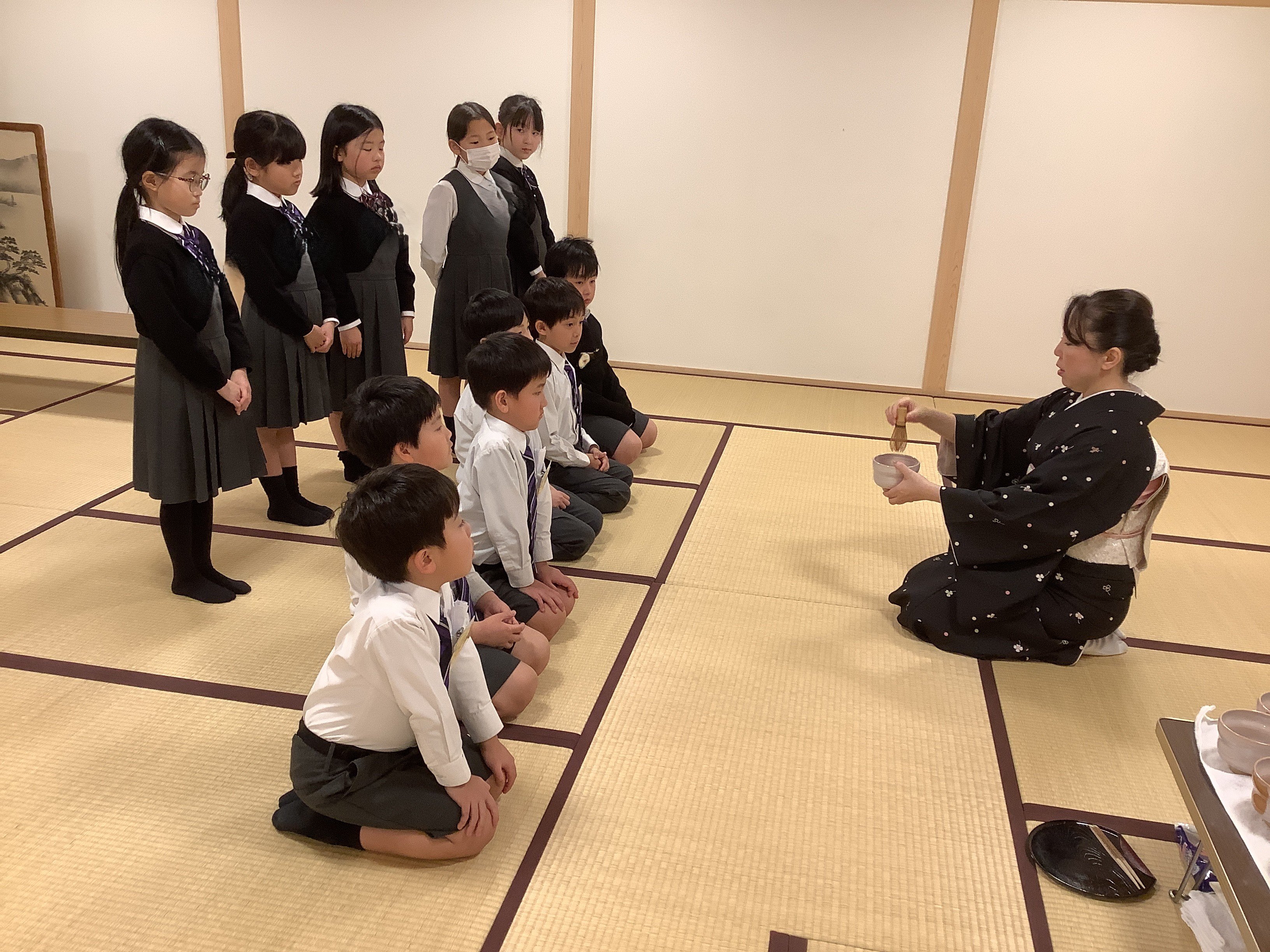 くすのきで、日本の伝統文化体験の一つとして、2月24日と27日に茶道教室を行いました。上田宗箇流の先生や保護者ボランティアの方にご協力いただき、子どもたちがお客さん役とお運びさんに分かれて行いました。一回目は、畳の上での作法や礼の仕方を教わりました。姿勢を正し、静かに動くことを意識する子どもたちの姿が印象的でした。二回目は、実際に自分たちでお茶を点て、級友に飲んでもらうという体験をしました。お運びさんは心を込めてお茶とお茶菓子を運び、、お客さんは「ありがとう」の気持ちでいただきました。お互いを思いやる気持ちに触れる、温かな時間となりました。また、座礼の仕方や姿勢を学び、礼儀の大切さを改めて感じる機会となりました。今後は、日常生活の中でも学んだことを意識していきたいと思います。