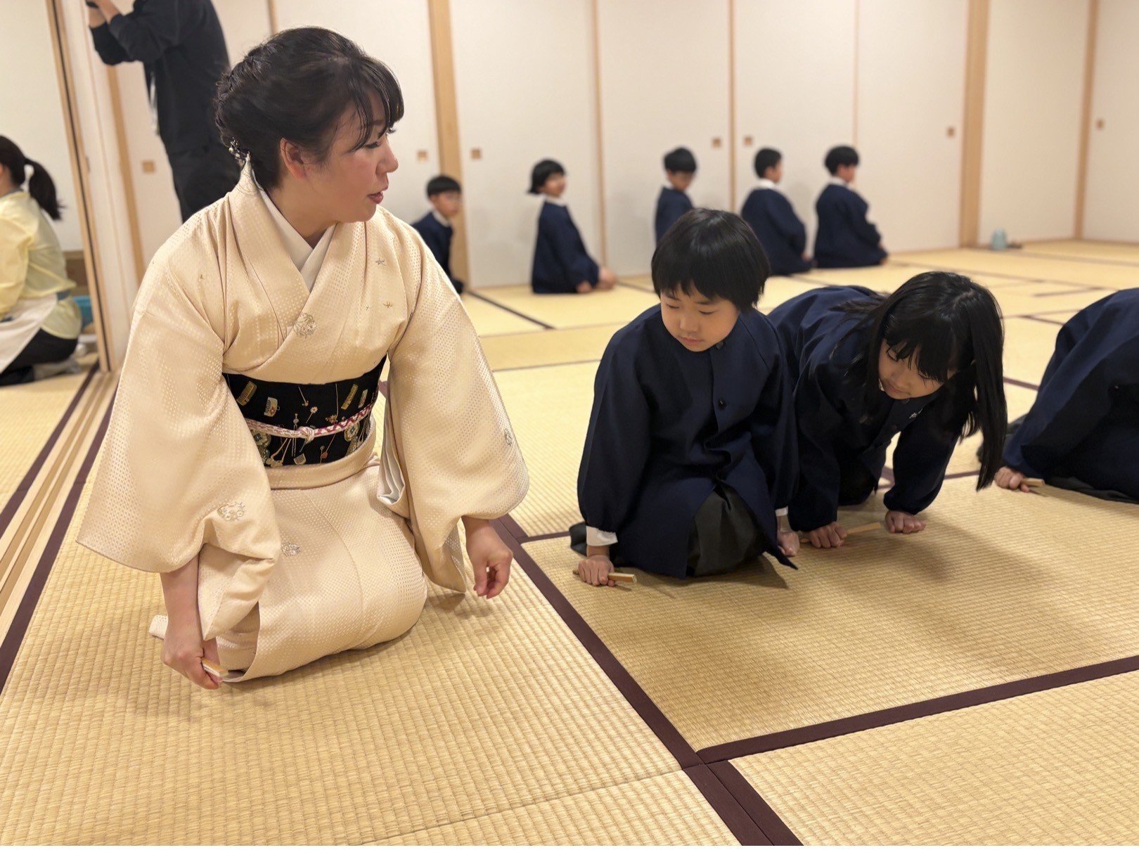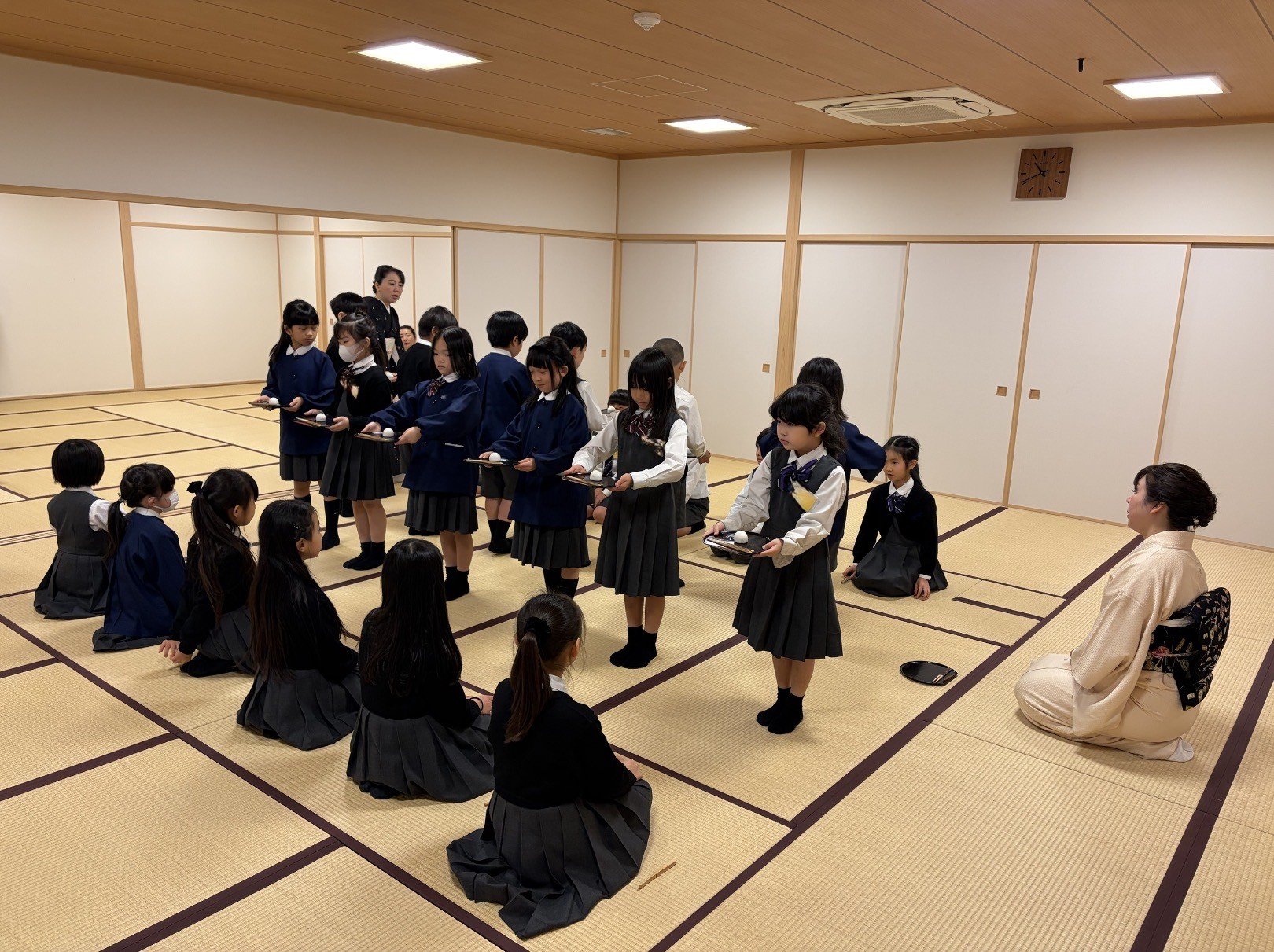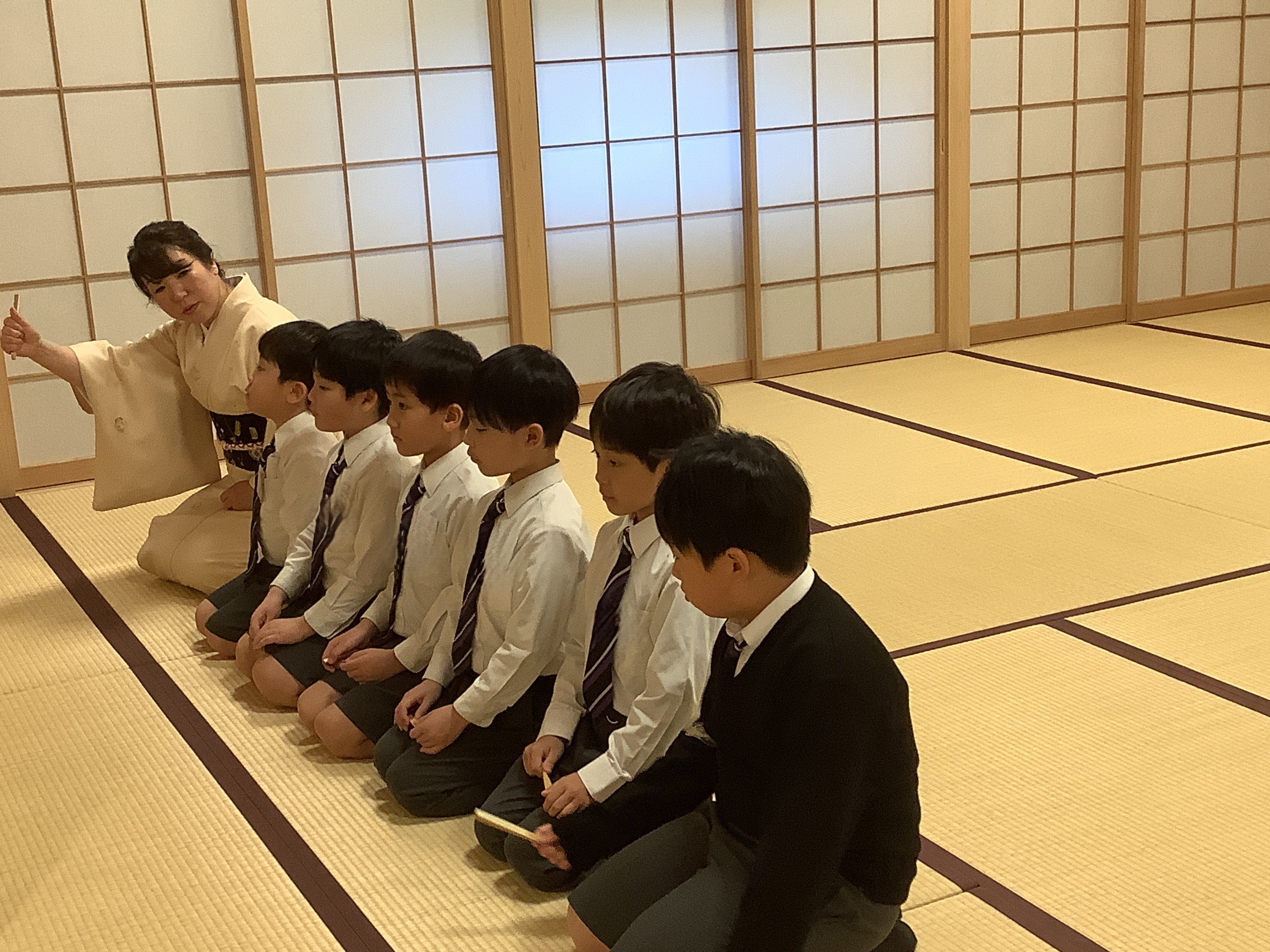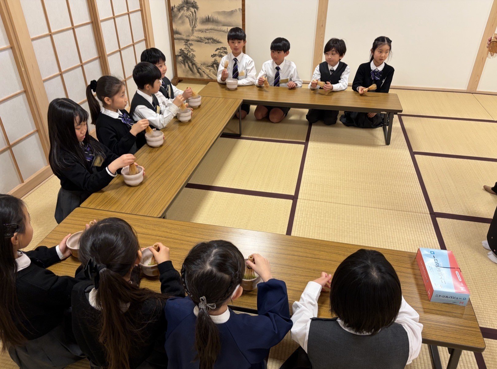 くすのきで、日本の伝統文化体験の一つとして、2月24日と27日に茶道教室を行いました。上田宗箇流の先生や保護者ボランティアの方にご協力いただき、子どもたちがお客さん役とお運びさんに分かれて行いました。一回目は、畳の上での作法や礼の仕方を教わりました。姿勢を正し、静かに動くことを意識する子どもたちの姿が印象的でした。二回目は、実際に自分たちでお茶を点て、級友に飲んでもらうという体験をしました。お運びさんは心を込めてお茶とお茶菓子を運び、、お客さんは「ありがとう」の気持ちでいただきました。お互いを思いやる気持ちに触れる、温かな時間となりました。また、座礼の仕方や姿勢を学び、礼儀の大切さを改めて感じる機会となりました。今後は、日常生活の中でも学んだことを意識していきたいと思います。